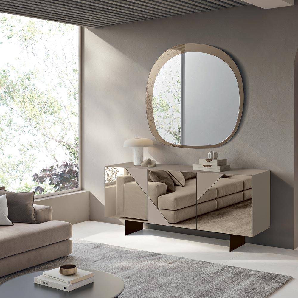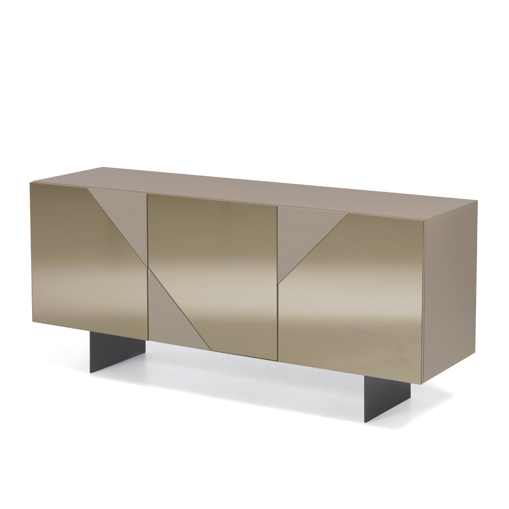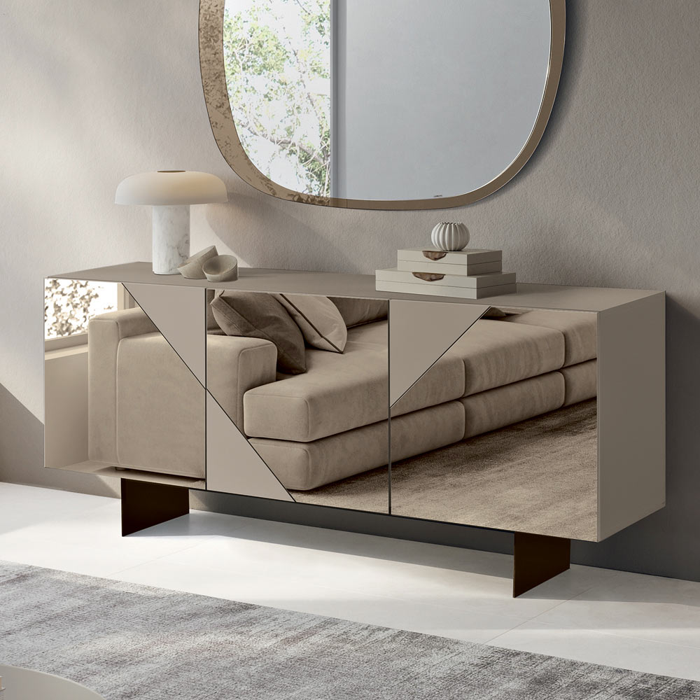 Die MDF-Türen sind mit Spiegelglas verkleidet, das glänzende und matte Oberflächen abwechselnd aufweist. Dadurch entsteht ein raffiniertes geometrisches Spiel, das das Licht einfängt und optische Tiefe erzeugt. Dieses kontrastierende Material verleiht dem Sideboard Eleganz und Dynamik – perfekt für moderne und anspruchsvolle Räume.
