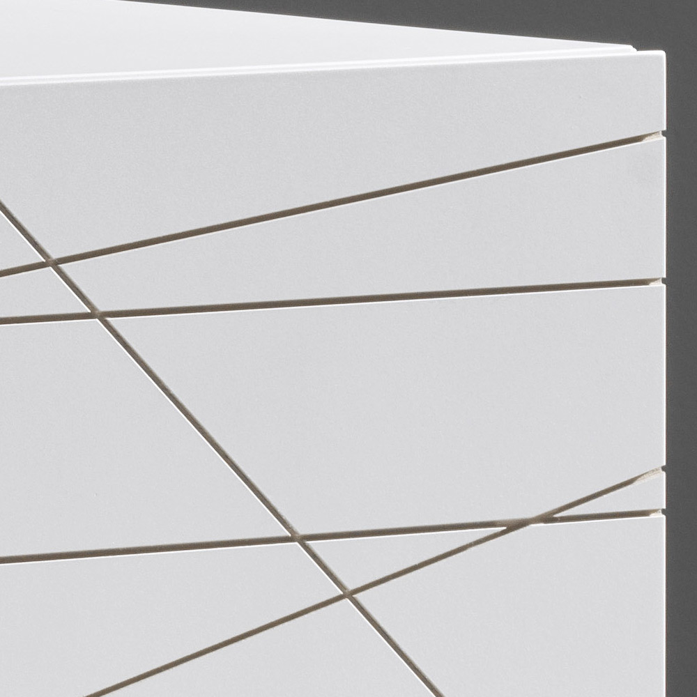 Ein optisch ansprechendes Sideboard, entworfen für moderne und exklusive Wohnräume. Die Türen ziert ein raffiniertes, graviertes Grafikdesign, das ein dynamisches Linienspiel erzeugt und der Oberfläche Bewegung verleiht – so wird das Möbelstück zu einem wahren Dekorationselement.