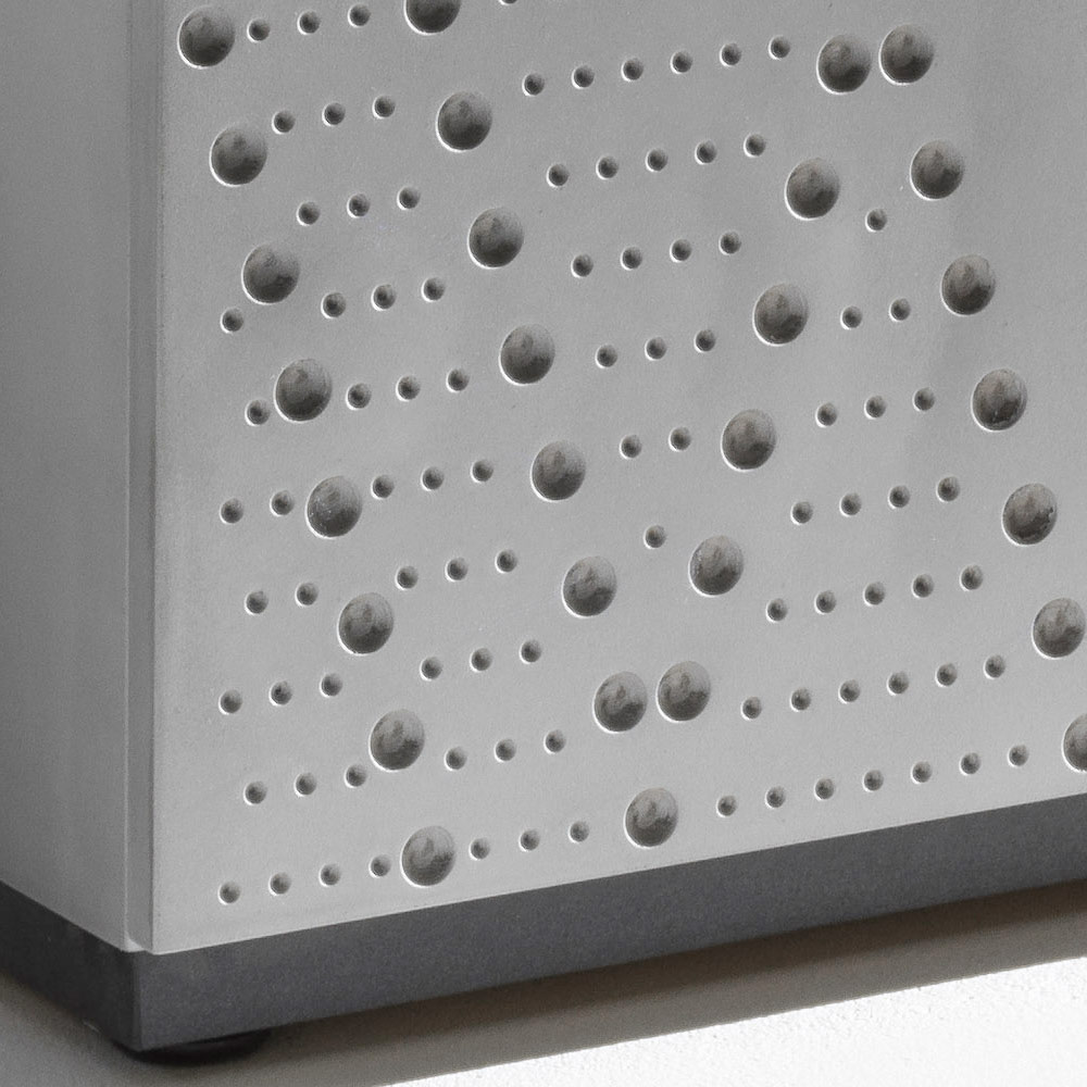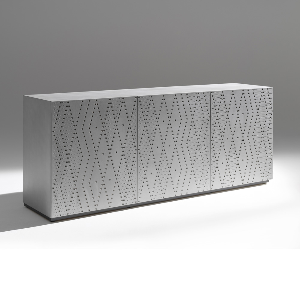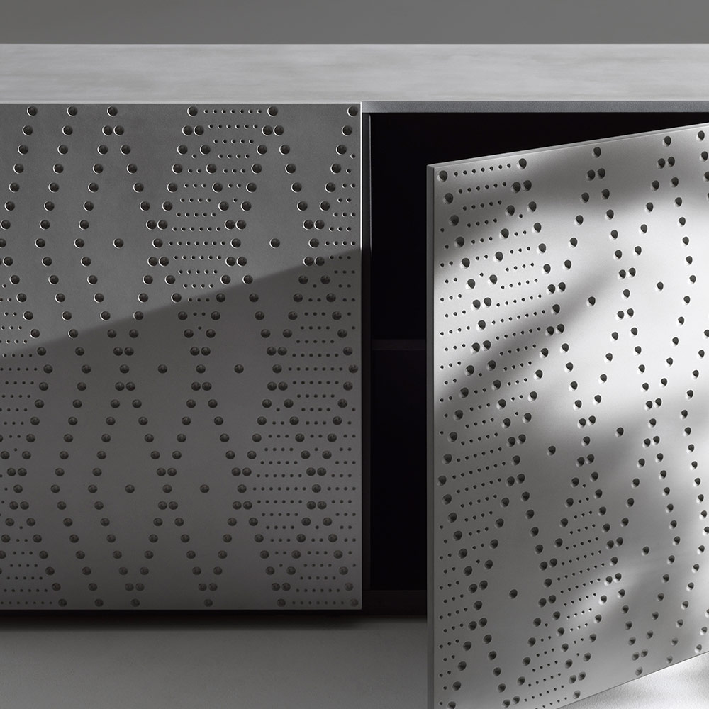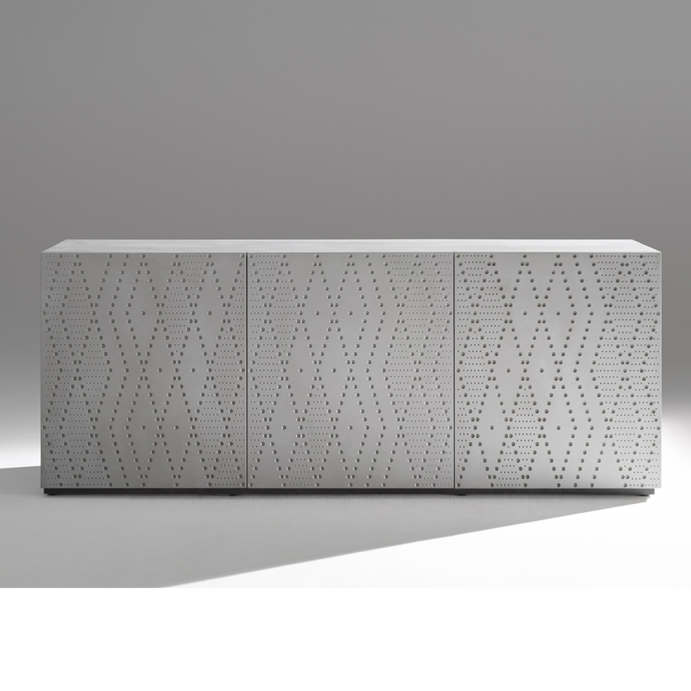 Ein Sideboard mit strukturierter, moderner Anmutung, dessen Türen mit einer raffinierten, gesprenkelten Aluminiumoptik verziert sind, die ein raffiniertes Spiel von Licht und Tiefe erzeugt. Ein ausdrucksstarkes Möbelstück für moderne, elegante und anspruchsvolle Räume.