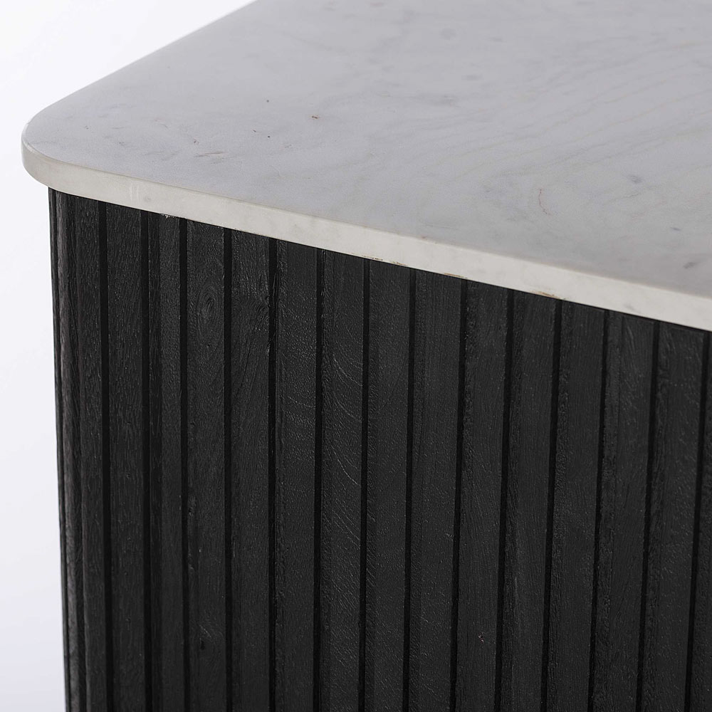 Dieses elegante Aufbewahrungsmöbel kombiniert modernes Design mit zeitloser Raffinesse und ist damit die perfekte Ergänzung für jeden anspruchsvollen Raum. Der schwarze geriffelte Holzrahmen erzeugt einen faszinierenden dreidimensionalen Effekt, der sofort ins Auge fällt und dem Möbelstück ästhetische Tiefe verleiht.