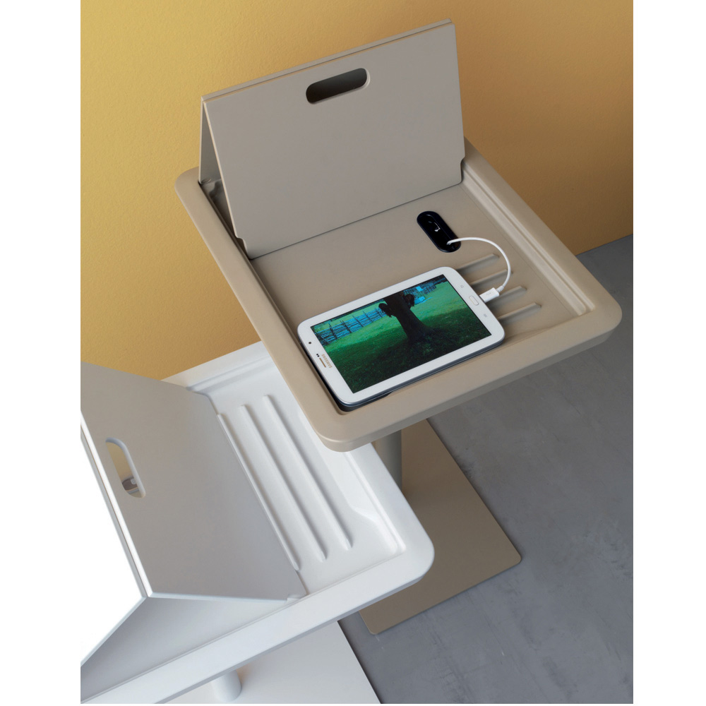 Dieser Couchtisches hat eine pulverbeschichtete Metallbasis und ein PVC - Oberseite in der gleichen Farbe , die geöffnet werden kann und moduliert. Es ist für Tablet-Halterung konzipiert und ausgelegt, mit einem Loch für die Durchführung des Kabels. Auf diese Weise ermöglicht Ihnen das Design der Ergänzung, jedes Objekt richtig zu verwenden und zu lagern und gleichzeitig die erforderlichen Kabel in Ordnung zu halten. Die Besonderheit liegt in der einstellbaren Höhe von 45 bis 65 cm, um mit digitalen Geräten maximalen Komfort zu erreichen und so den aktuellsten häuslichen Bedürfnissen gerecht zu werden.