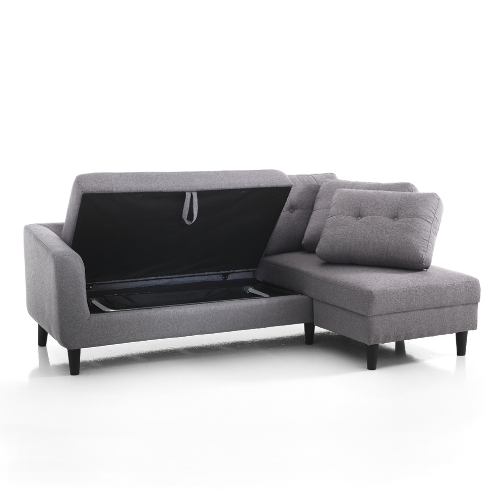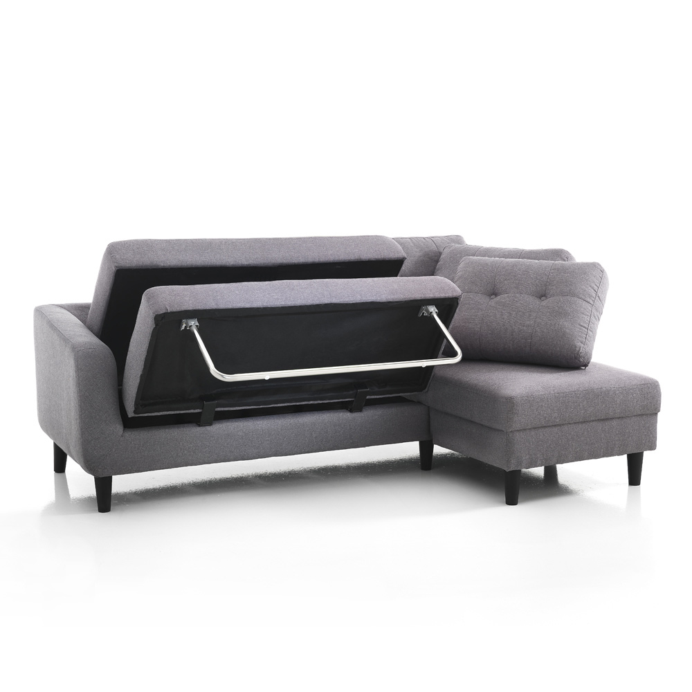 Sofa mit praktischem Mechanismus und Element zum Zusammenstellen des Klappbetts unter der Sitzfläche, Sitzfläche mit nicht abnehmbarem grauem Stoffbezug, Füße aus mattschwarzem Kunststoff, komplett . Dieses Produkt verkörpert den Komfort und die Funktionalität eines Sofas und eines Bettes. Im geschlossenen Zustand ist es ein Sofa mit einer umhüllenden und bequemen Sitzfläche, das Momente der Ruhe und Gelassenheit bietet. Wenn es geöffnet ist, wird es zum perfekten Bett für Gäste und bietet einen komfortablen und erholsamen Schlaf.