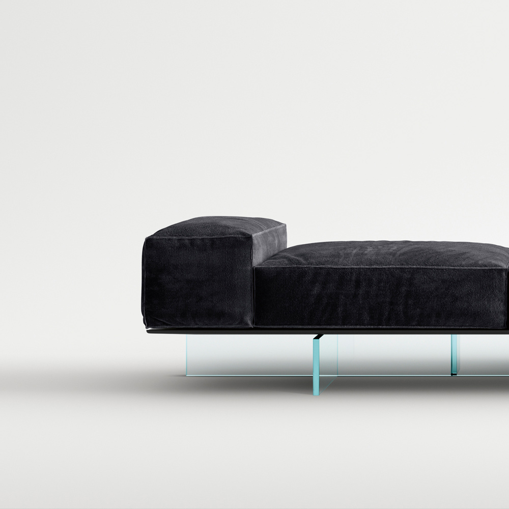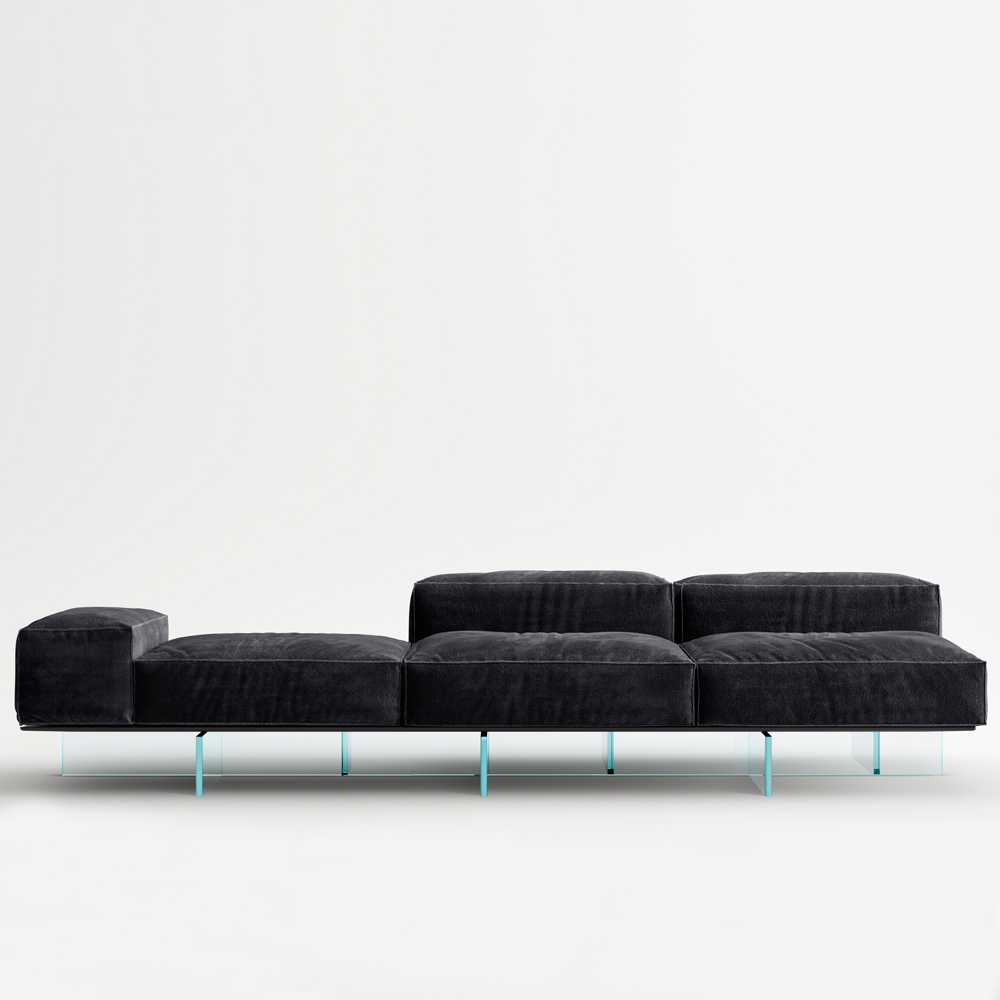 2-Sitzer-Wohnzimmersofa mit Hocker , hergestellt mit einer tragenden Struktur aus Tischlerplatten auf Untergestellen aus extraklarem, 20 mm dickem, geschweißtem und laminiertem Glas . Sitz und Rückenlehne mit Polyurethanschaum unterschiedlicher Dichte gepolstert, mit Matratze aus Acrylfaserstapeln und mit schützendem Stoff bezogen. Der Außenbezug besteht aus abnehmbarem Stoff mit sichtbaren Doppelnähten. Das aus weichen und großzügig gepolsterten Volumen bestehende Sitzsystem eröffnet eine neue Art der Gestaltung des Wohnraums mit Elementen, die originelle, dynamischere und informellere Kompositionen ermöglichen. Das Sofa behält seine optische Leichtigkeit dank der Basis, die aus laminierten Glasfüßen besteht, die eine Holzplattform tragen, auf der die Polsterelemente ruhen. Hochwertige Stoffe und raffinierte Details in der Verpackung zeichnen ein Projekt mit unkonventionellem Charakter aus.