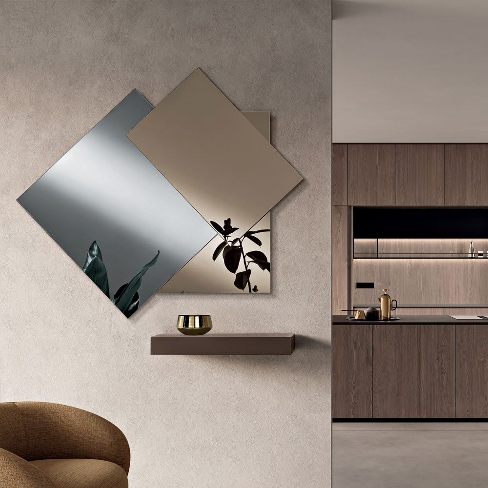 Das Ergebnis ist ein Spiegel mit modernem und dynamischem Charakter, perfekt für zeitgenössische Räume, in denen die Wand im Mittelpunkt steht. Die Kombination verschiedener Farbtöne erzeugt warme und edle Reflexionen und verstärkt die Helligkeit des Raumes.
