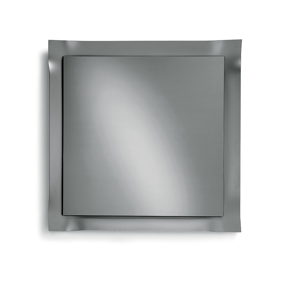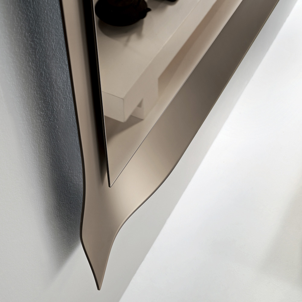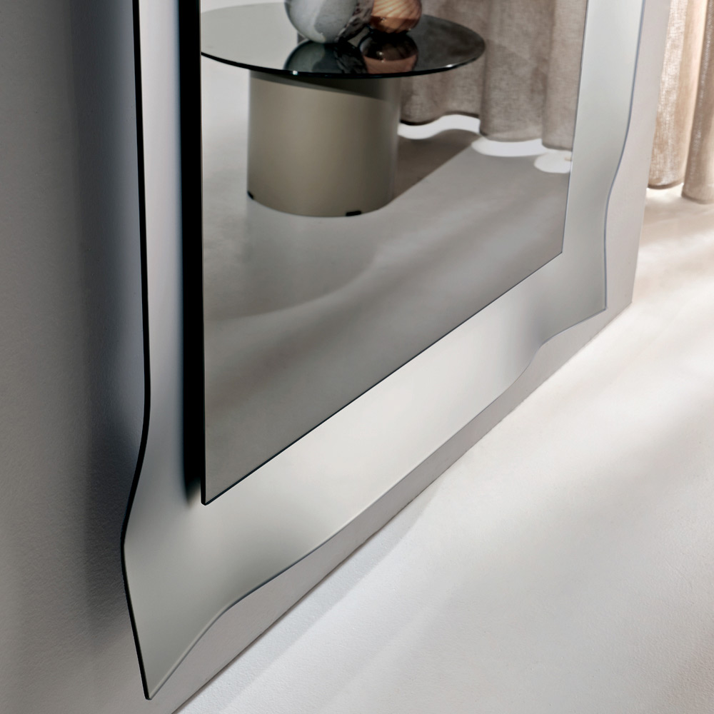 Die reflektierende Oberfläche ist von einem mattierten Glasrahmen mit leicht abgerundeten Ecken eingefasst. Dieses Verfahren fängt das Licht auf subtile Weise ein und bricht es, wodurch ein elegantes Spiel der Reflexionen entsteht, das die Oberfläche belebt und dem Spiegel Tiefe verleiht.