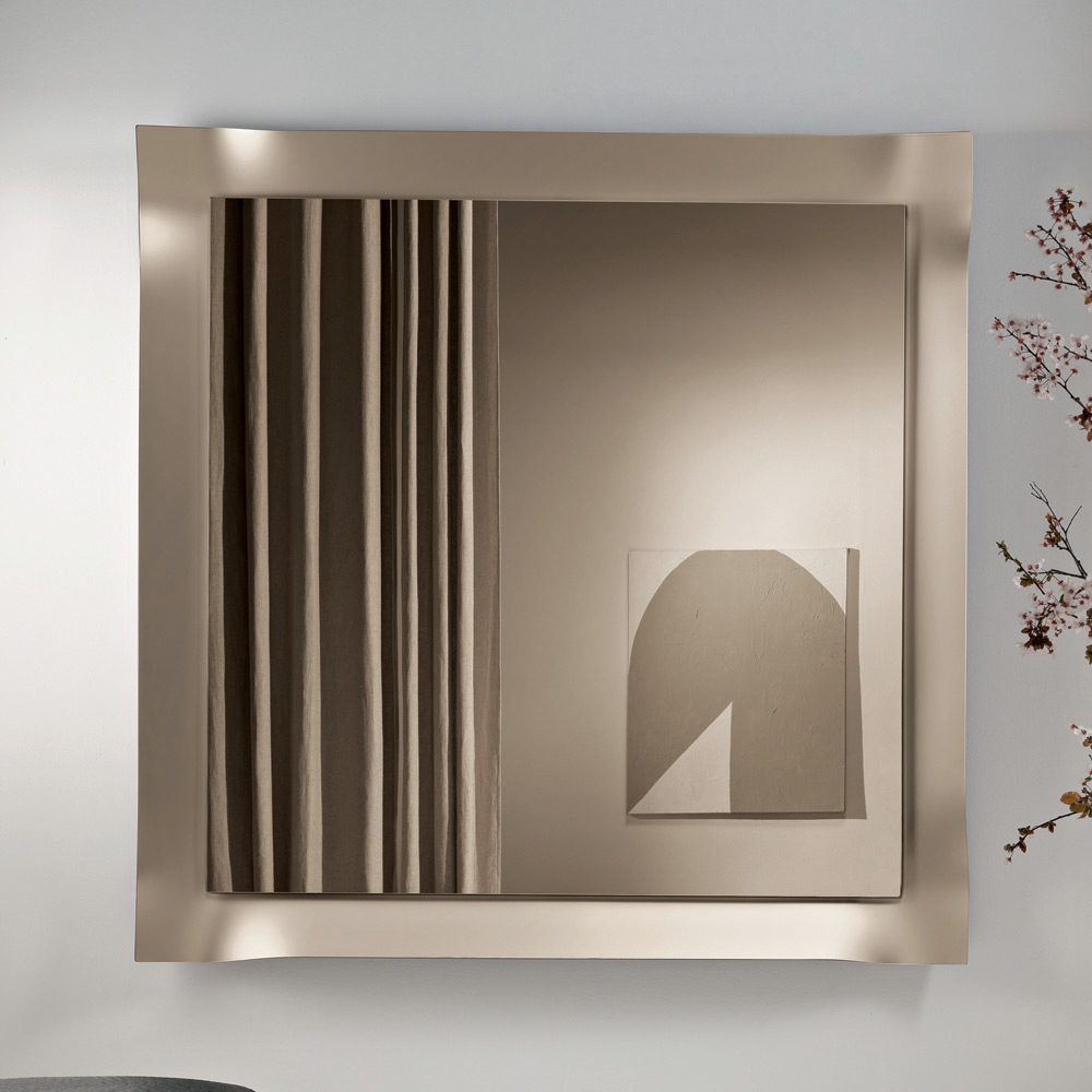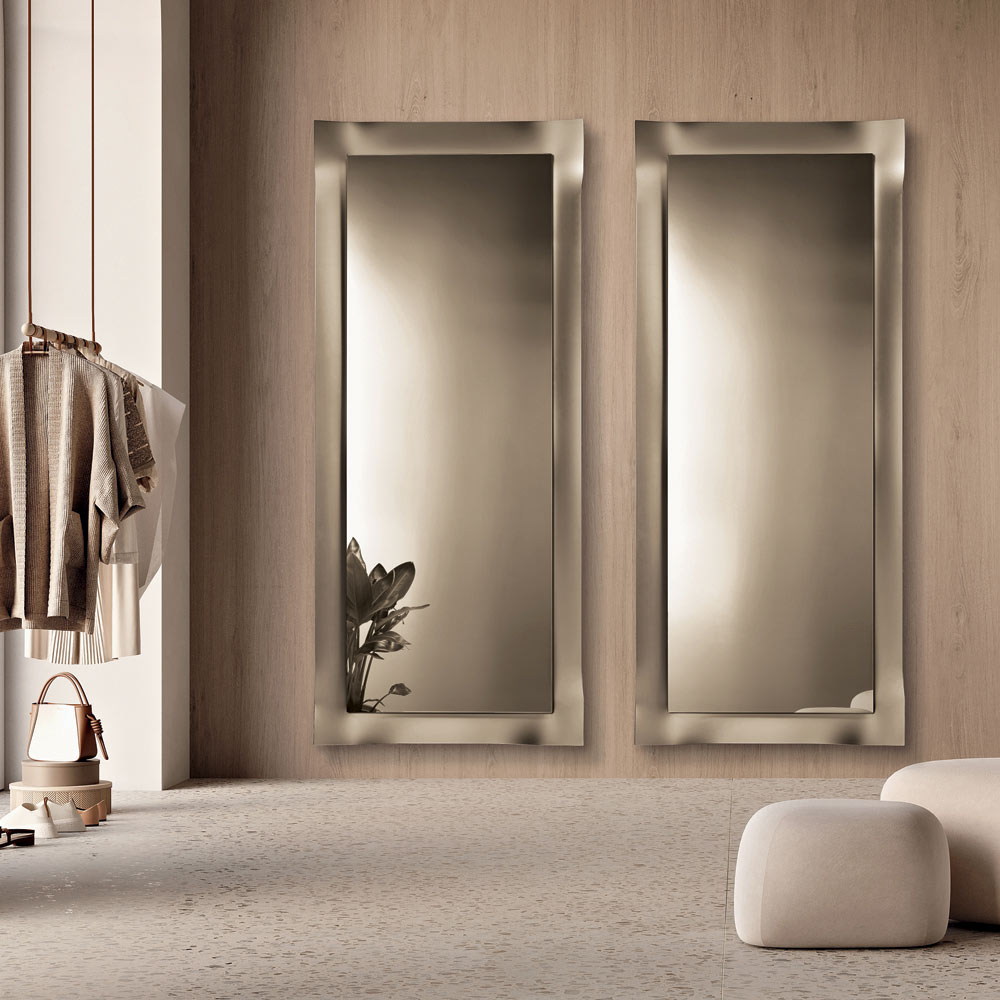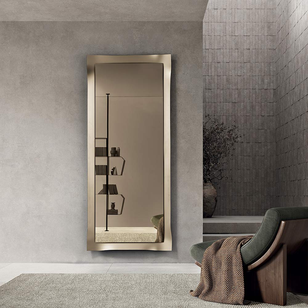 Dank seiner gelungenen Balance zwischen Schlichtheit und Raffinesse wirkt dieser Spiegel an der Wand elegant und ist somit ein ideales Einrichtungsaccessoire für moderne und zeitgenössische Umgebungen, das die Helligkeit des Raumes verstärkt.