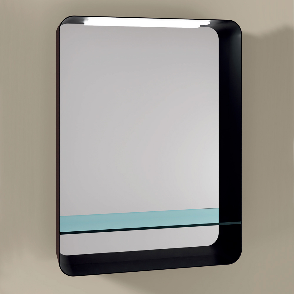 Spiegel mit mattschwarzem Metallrahmen und transparenter Glasablage , vollständig in Italien hergestellt.