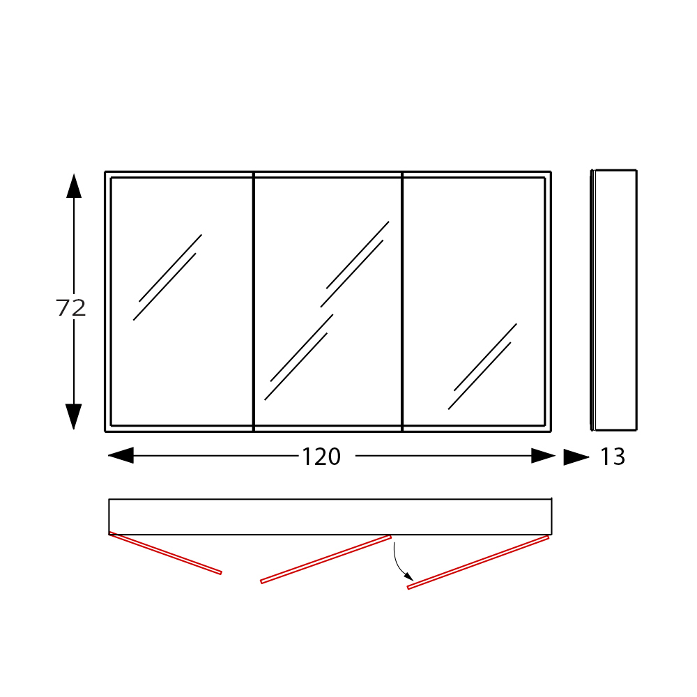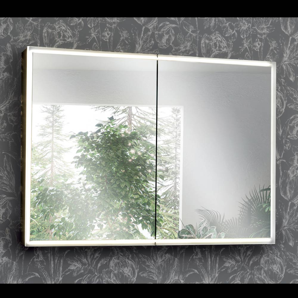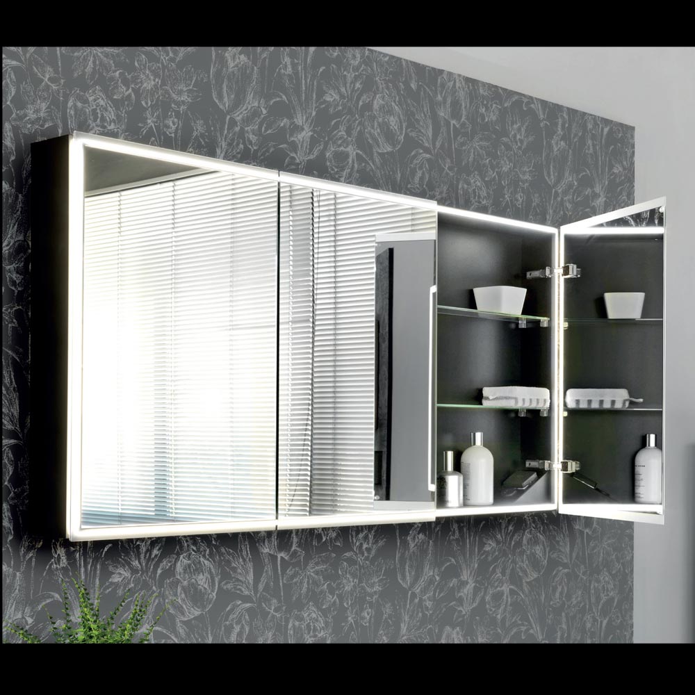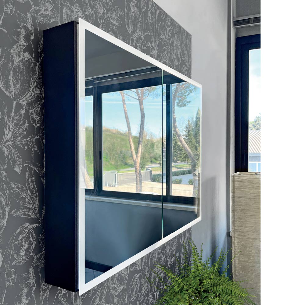 Die doppelt verspiegelten Türen öffnen sich und geben den Blick auf einen geräumigen Innenbereich frei, der sich ideal für die organisierte Aufbewahrung all Ihrer Körperpflegeprodukte eignet. Das LED-Licht unterstreicht nicht nur das Design, sondern sorgt auch für funktionelles Licht und eignet sich daher perfekt für Make-up, Hautpflege oder als zusätzliche Beleuchtung im Badezimmer.