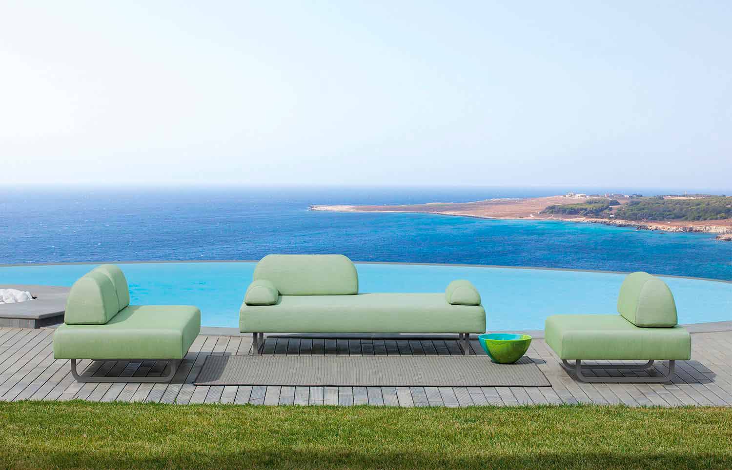 Quadratischer Pouf 90x90 cm für die Außengestaltung aus pulverbeschichtetem verzinktem Eisen und 100 % gefärbtem Acrylgewebe. Hergestellt in Italien.