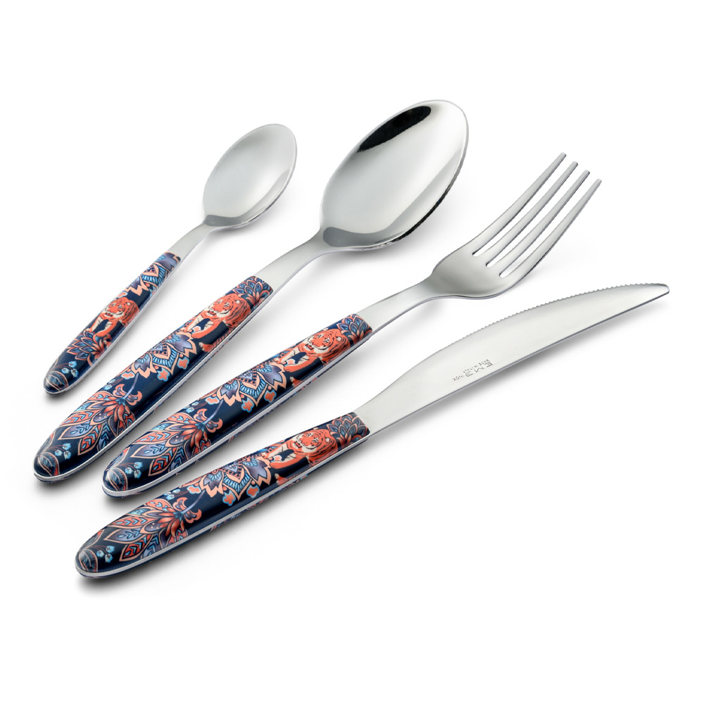 Edelstahlbesteck und farbiger Kunststoffgriff mit Tiger, 24-teilig made in Italy.