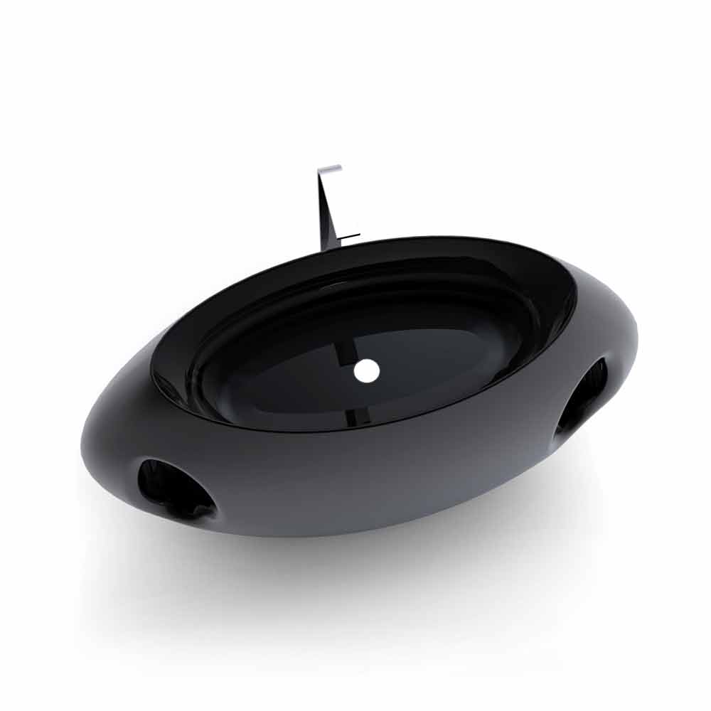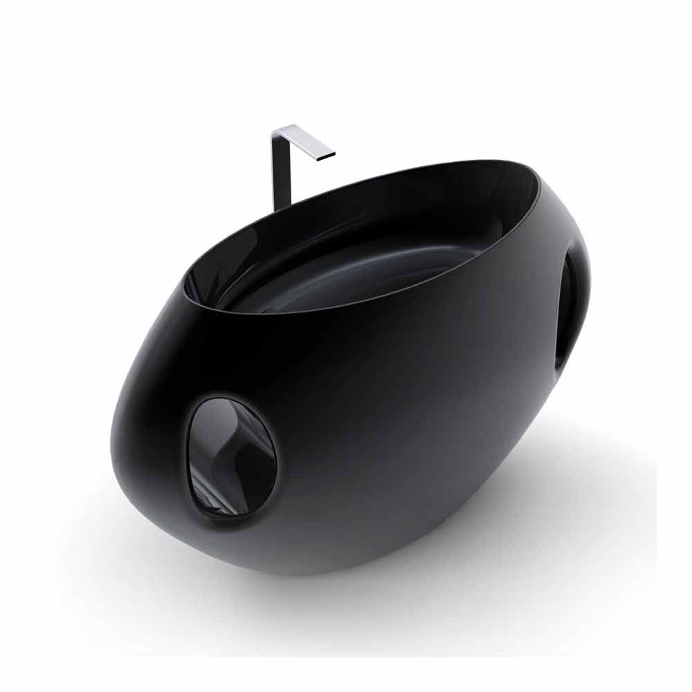 Szenografisches Waschbecken aus Solid Surface; freistehend, mit Formen, die von großen klassischen Vasen inspiriert sind. Es zeichnet sich durch elliptische Geometrielinien aus, breit und gestreckt, die die Ergänzung markieren. Seine großzügigen Formen und die beiden Ellipsen in Form von "Griffen" zeigen ein Profil, das an die Form einer großen Vase erinnert. Sein Name „Pandora“ bezieht sich in der Tat auf das berühmteste der antiken Gefäße aus der Welt der griechischen Mythologie, die mythische Büchse der Pandora. Seine Merkmale sind neben dem in die Breite „gestreckten“ Vasenprofil auch ein komfortables und breites Becken mit horizontalem Schnitt und zwei elliptischen Zierschlitzen an den Fronten, die es seitlich durchziehen und auch als Handtuchhalter dienen. Die Sanitärarmatur hat eine gute Ergonomie, da sie reichlich abgerundet ist, erhältlich in zwei Farbvarianten: Weiß (RAL9003) oder Schwarz (RAL9005)