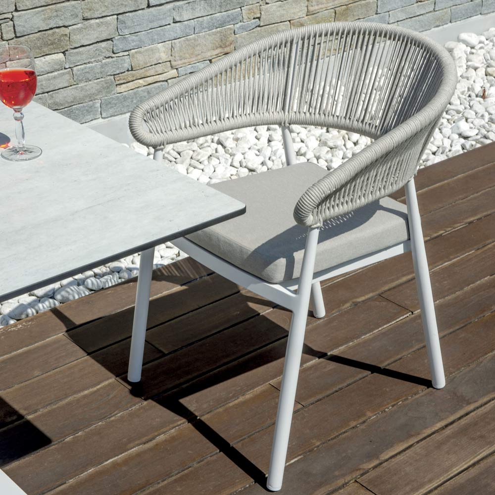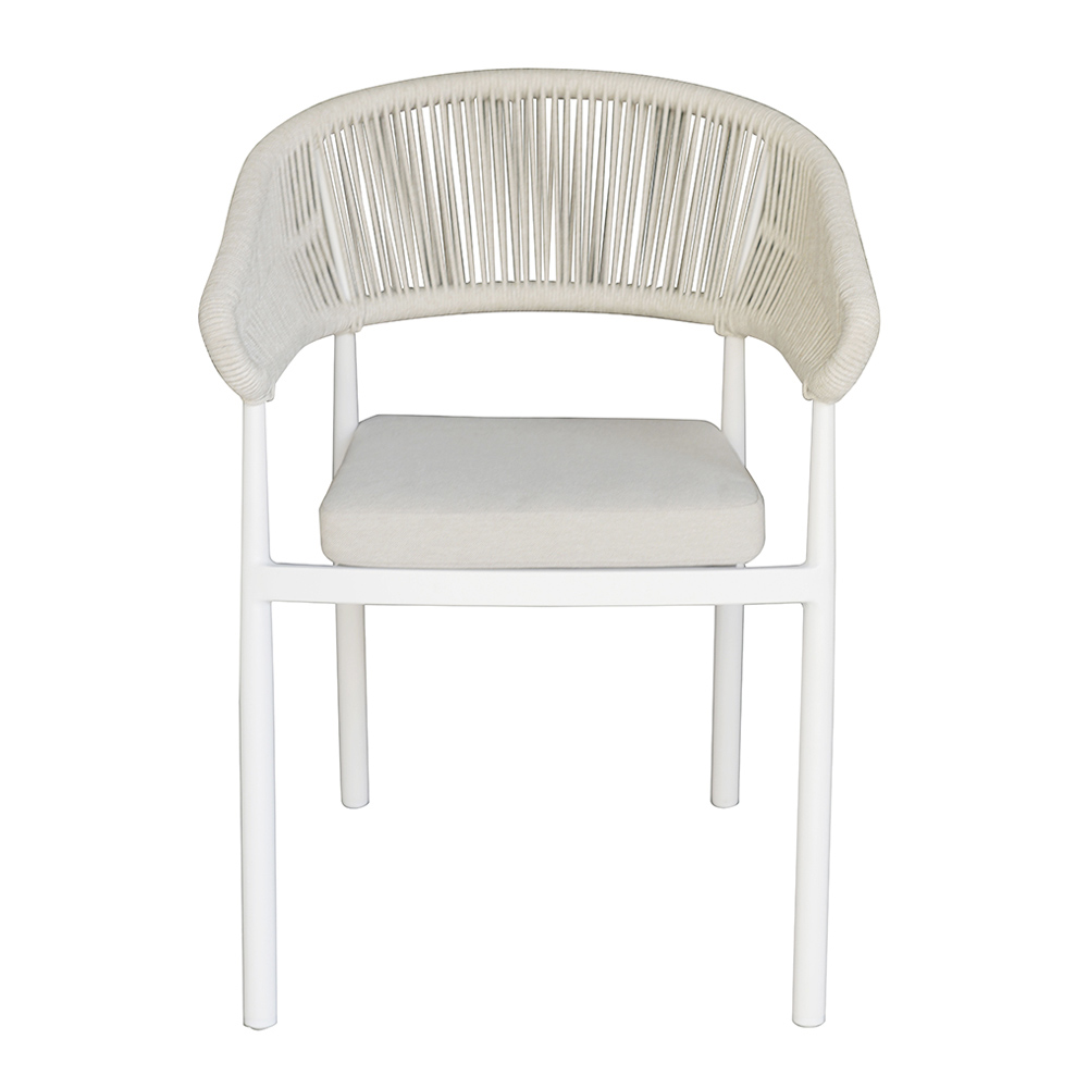Stapelbarer Outdoor-Stuhl mit Aluminiumrahmen, Rückenlehne aus Seil und Aluminiumsitz mit Kissen.