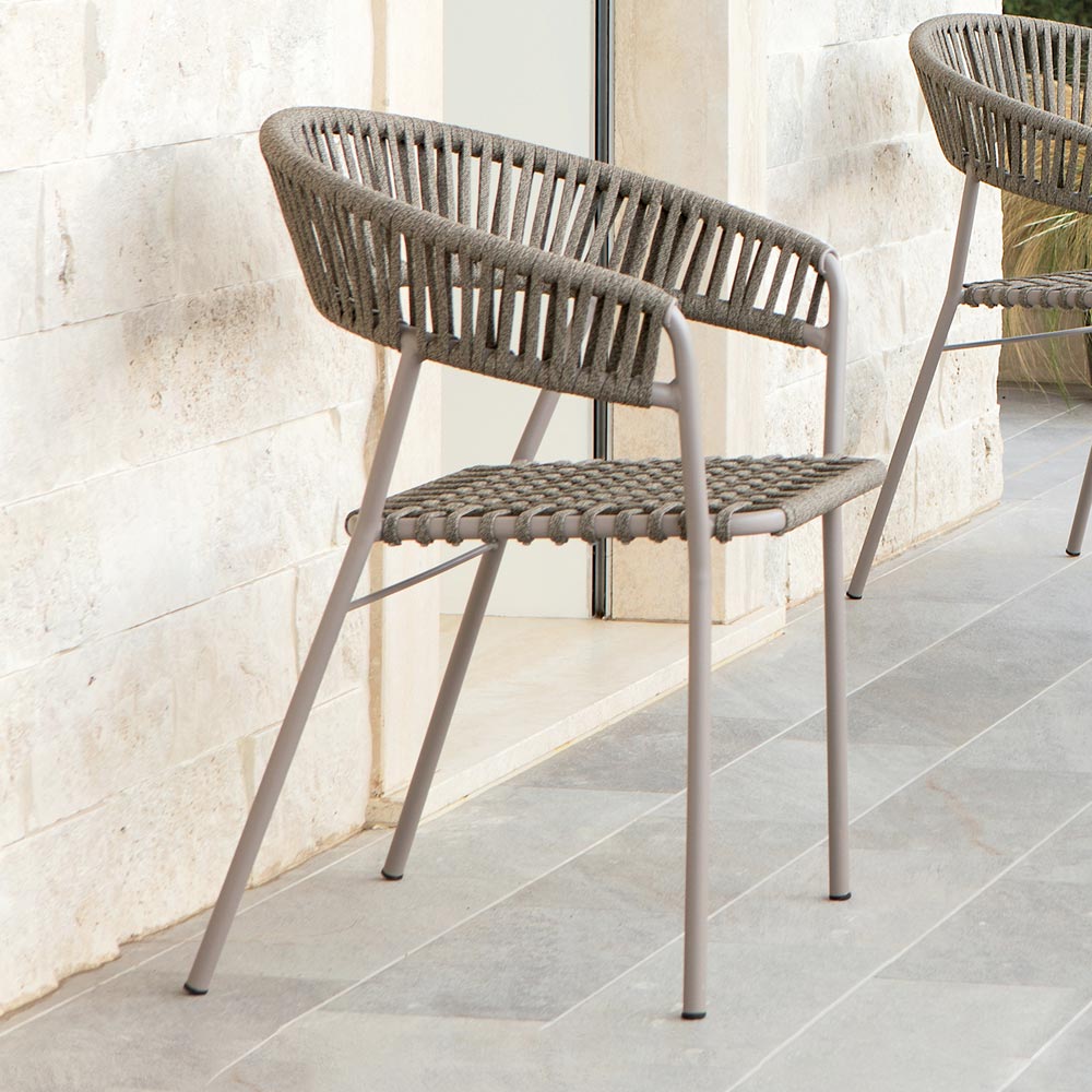 2 stapelbare Sessel für Gartenmöbel, handgefertigt in Italien aus schlammfarbenem verzinktem Stahl mit Sitz und Rückenlehne aus schlammfarbenem Seil . Die Verzinkung sorgt für eine höhere Beständigkeit der Materialoberfläche gegen korrosive Witterungseinflüsse wie Salz und Säure des Regens, während die Seile beständig gegen Chlor und Sonnenstrahlen sowie schimmelresistent sind.