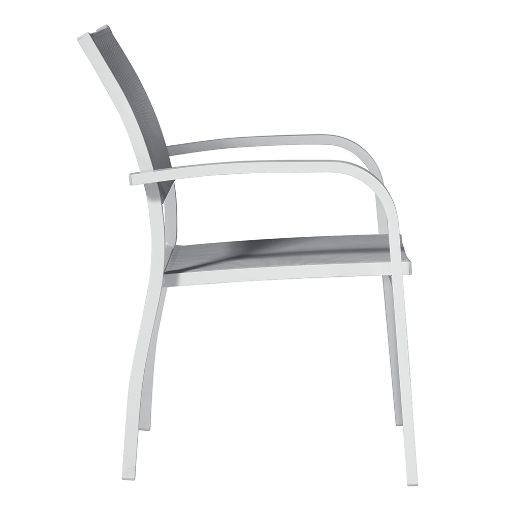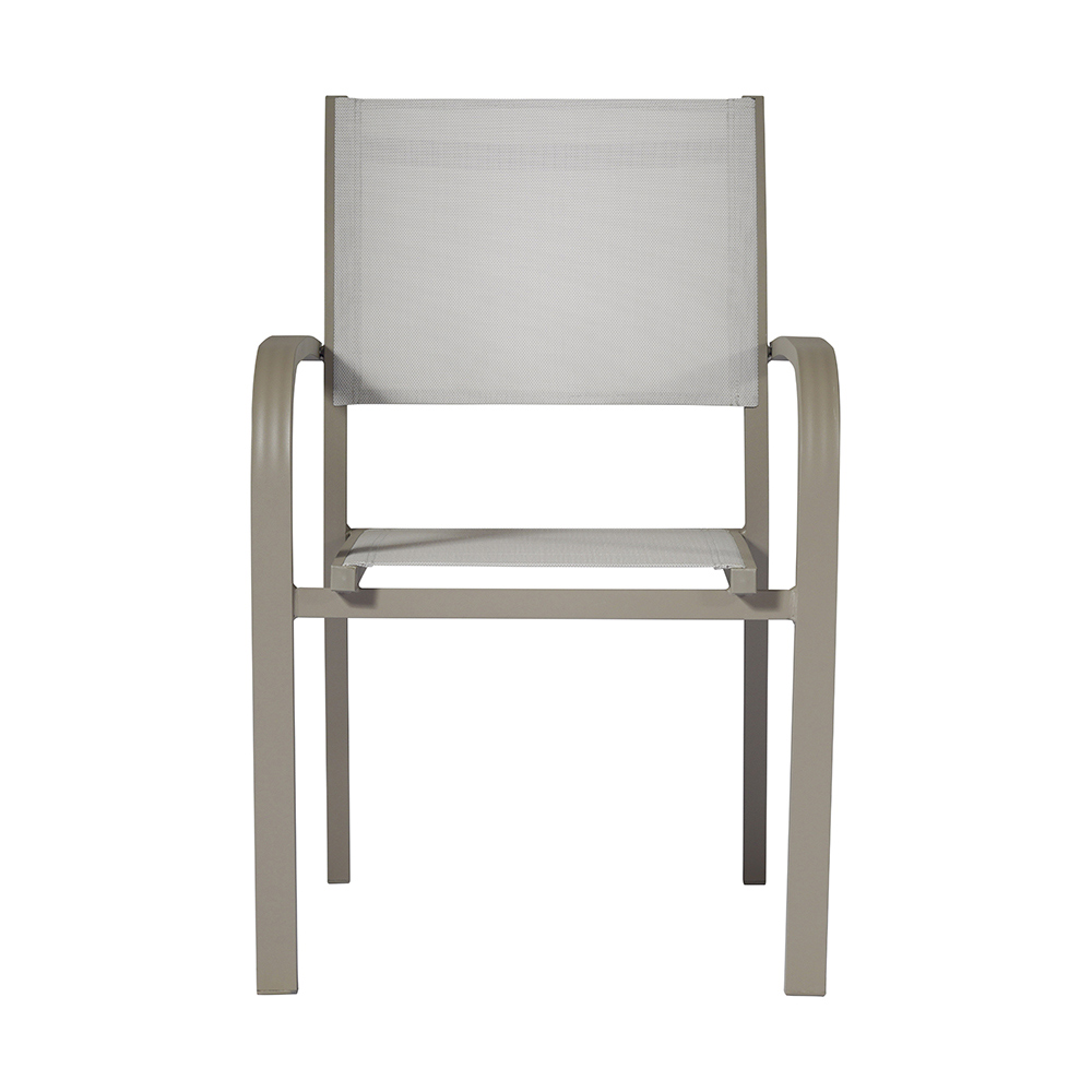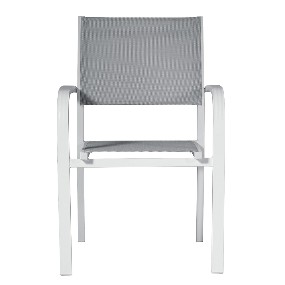 Stapelbarer Outdoor- Stuhl mit Aluminiumstruktur und Sitz und Rückenlehne aus hellgrauem, gepolstertem Textilene , bereichert durch elegante Armlehnen . Dieser Outdoor-Stuhl kombiniert Design und Einfachheit , das Ergebnis einfacher, aber widerstandsfähiger Materialien, die einem Produkt mit einem originellen und avantgardistischen Stil Leben einhauchen, das sich perfekt für jede Umgebung eignet.