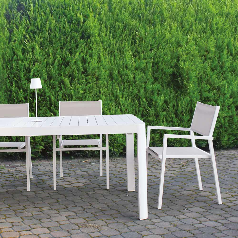 Sitz und Rückenlehne aus Textilene , einem atmungsaktiven und bequemen technischen Material, garantieren auch an den heißesten Tagen ein ergonomisches und angenehmes Sitzerlebnis . Die Farbe verleiht dem Stuhl eine schlichte Eleganz und eignet sich perfekt als Begleitung zu Ess- oder Couchtischen in Gärten, auf Terrassen oder in Objekträumen.