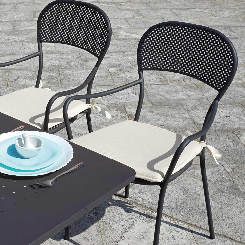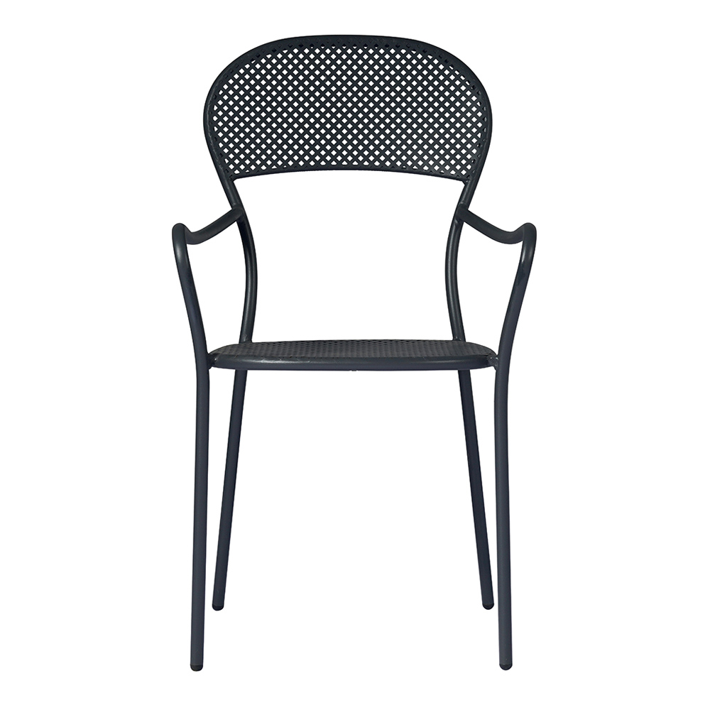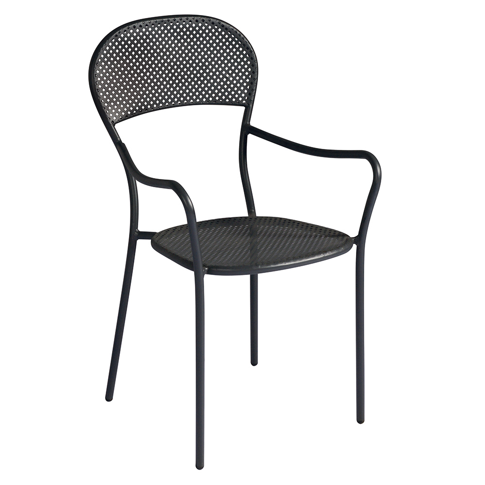 Outdoor-Stuhl aus Eisen mit anthrazitgrauer Oberfläche mit stapelbarer Struktur und praktischen Armlehnen . Dieses moderne Möbelstück hat ein unverwechselbares Design mit einer bequemen und bequemen Sitzfläche . Eine Einrichtungsidee, die jedem Außenbereich Charakter und Persönlichkeit verleihen kann, von Wohnräumen wie Gärten und Terrassen bis hin zu Objektbereichen wie Bars und Restaurants im Freien.