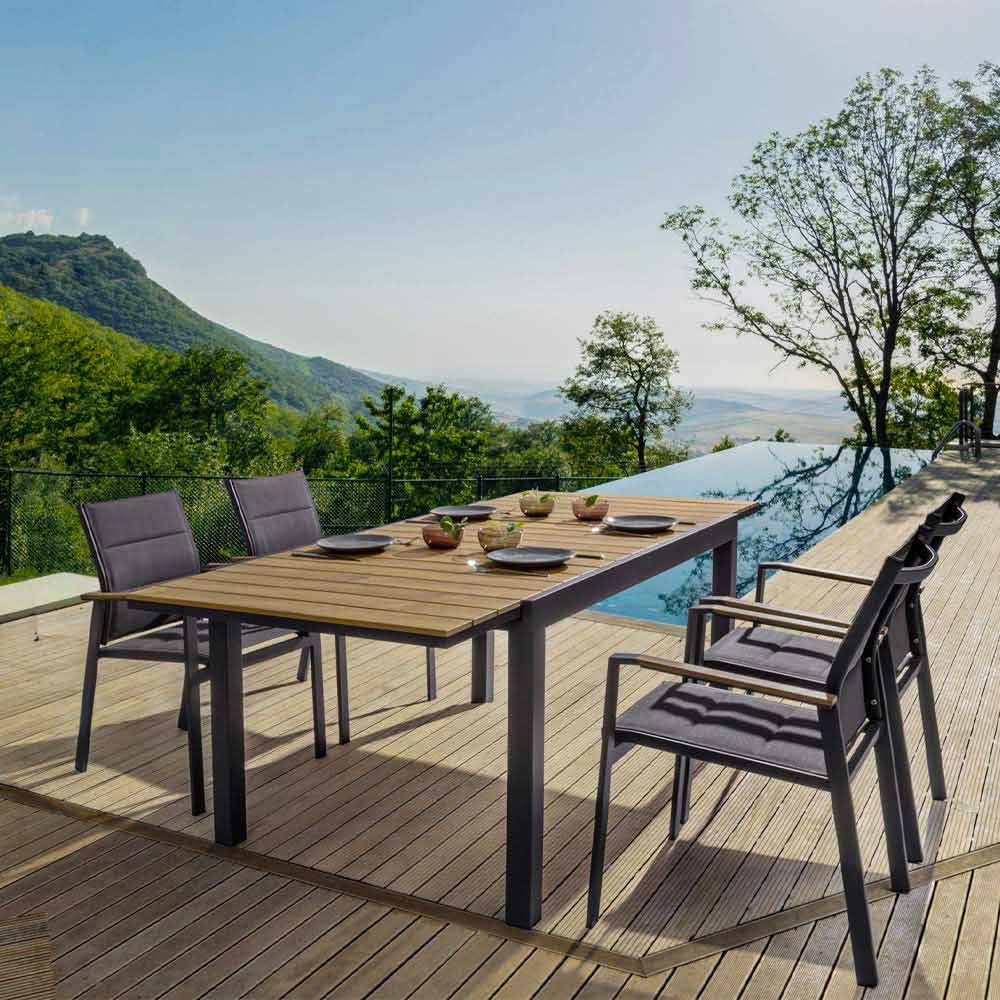 Stapelbarer Gartenstuhl aus Aluminium und Textil mit Armlehnen, 6 Stück.