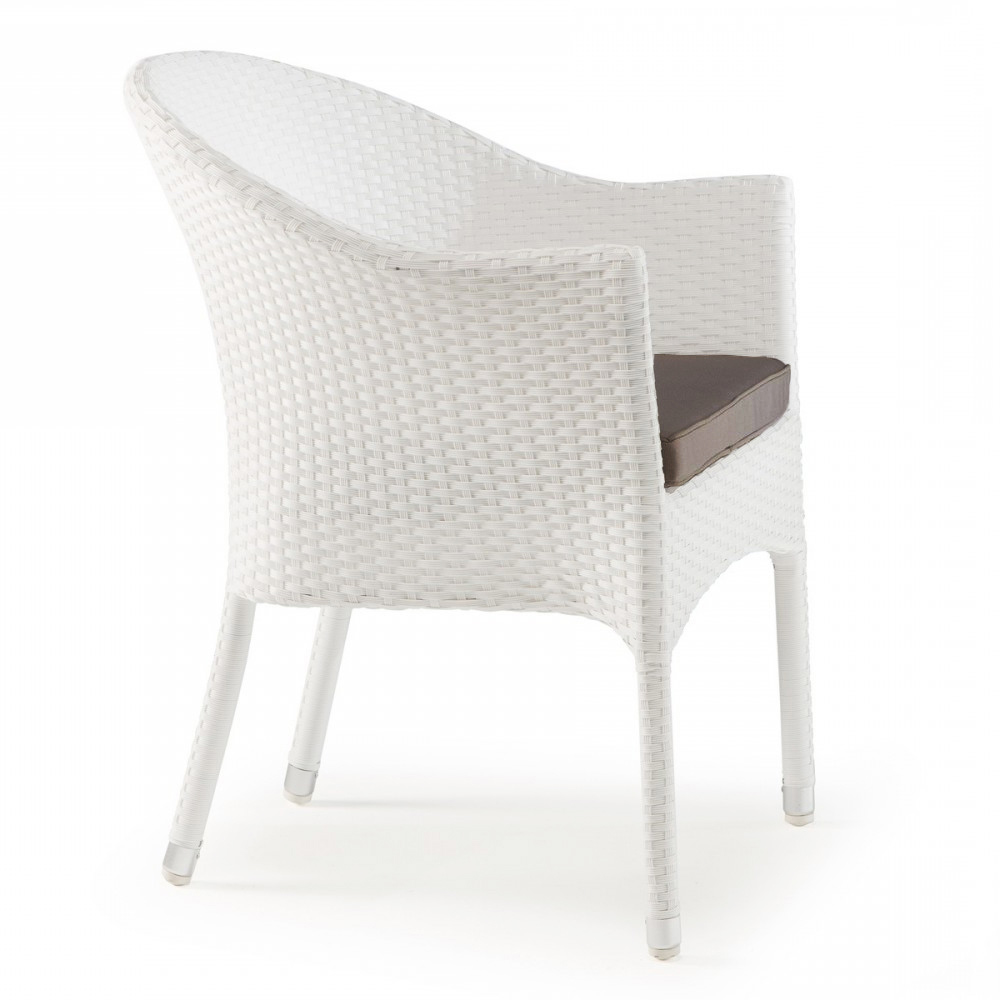 Gartensessel mit einem Aluminiumrahmen, der mit weißem Korbgeflecht bezogen ist, und einem Sitzkissen aus mokkafarbenem Stoff.