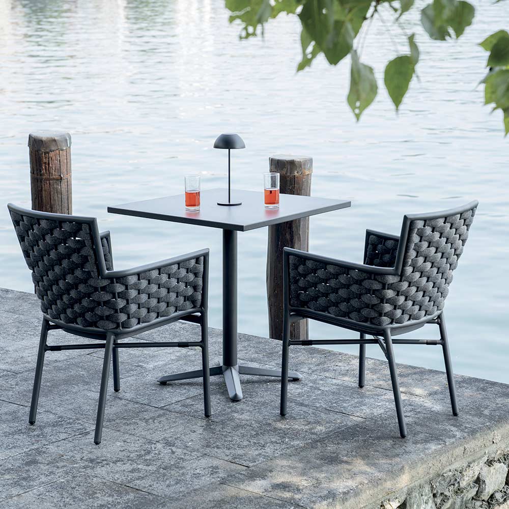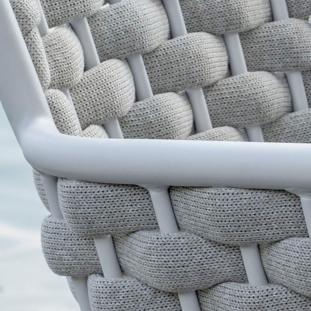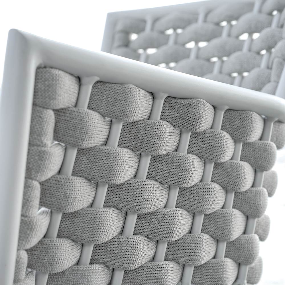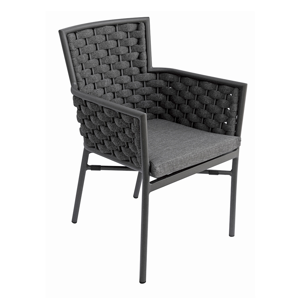 Stapelbarer Outdoor-Stuhl mit Aluminiumrahmen, gepolsterter Rückenlehne und Armlehnen aus Seil und Aluminiumsitz mit Kissen.