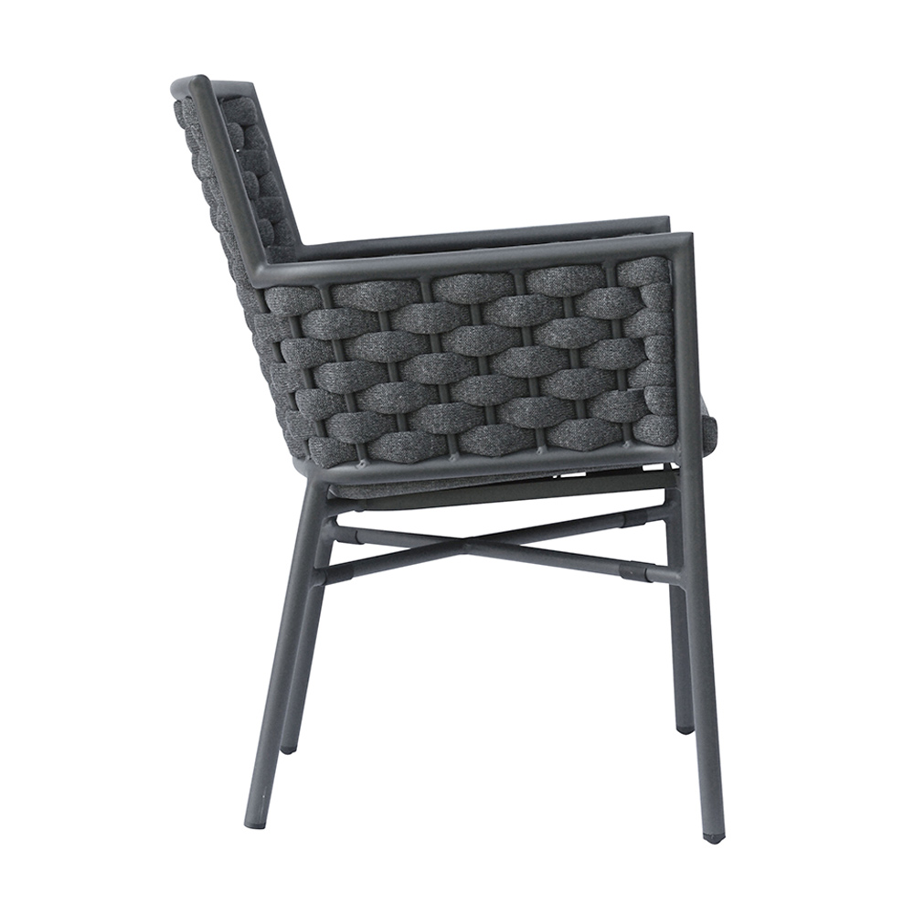 Raffinesse und Komfort treffen sich in diesem Außenstuhl mit einem modernen und gemütlichen Design. Die weiche und strapazierfähige geflochtene Seilrückenlehne und die Armlehnen verleihen dem Stuhl einen Hauch von handwerklicher Eleganz, während die Polsterung höchsten Komfort bietet, ideal für entspannte Momente im Freien.