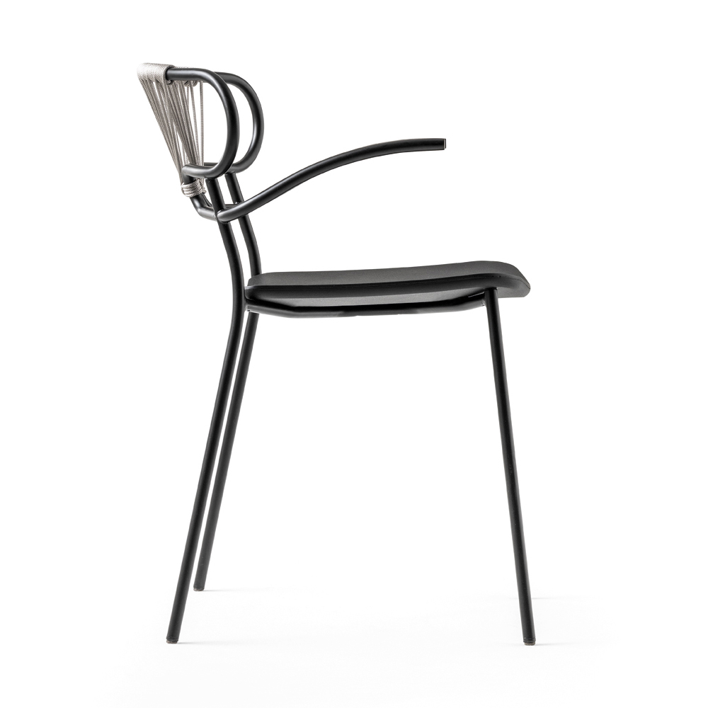 Stuhl für Esszimmer oder Küche made in Italy mit schwarz lackierter Metallstruktur und grauem Seil mit schwarz lackiertem Eschenholzsitz. Eine originelle Einrichtungslösung in ihrer Einfachheit, angereichert und einzigartig gemacht durch die besondere Form der Rückenlehne, die durch die Krümmung eines einzelnen Metallrohrs und durch das in einem Seil eingewebte Detail erhalten wird, das eine originelle und extrovertierte Persönlichkeit verleiht. Dank der neutralen Oberflächen und seiner Wesentlichkeit ist dieser Stuhl eine perfekte Lösung für moderne Umgebungen, in denen eine funktionale und kreative Idee erforderlich ist, die nicht unbemerkt bleibt, diskret bleibt und gleichzeitig die Möglichkeit bietet, Ihre Räume zu stapeln, um sie optimal zu optimieren.