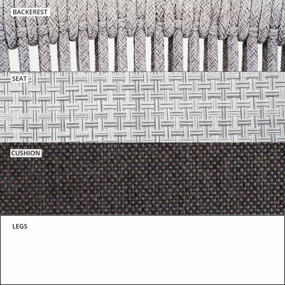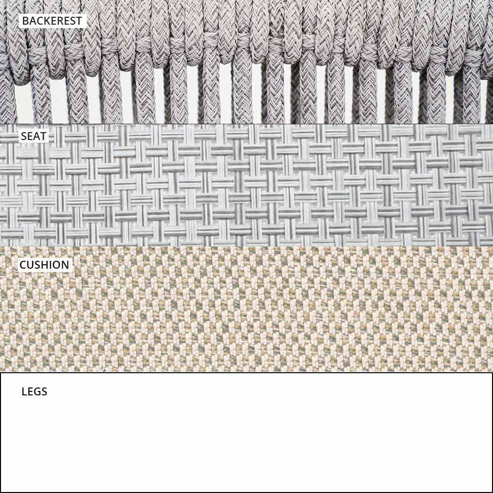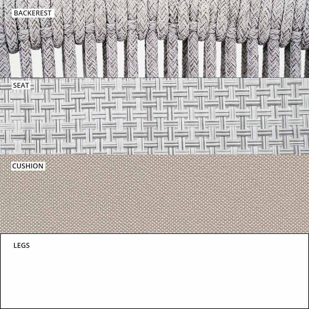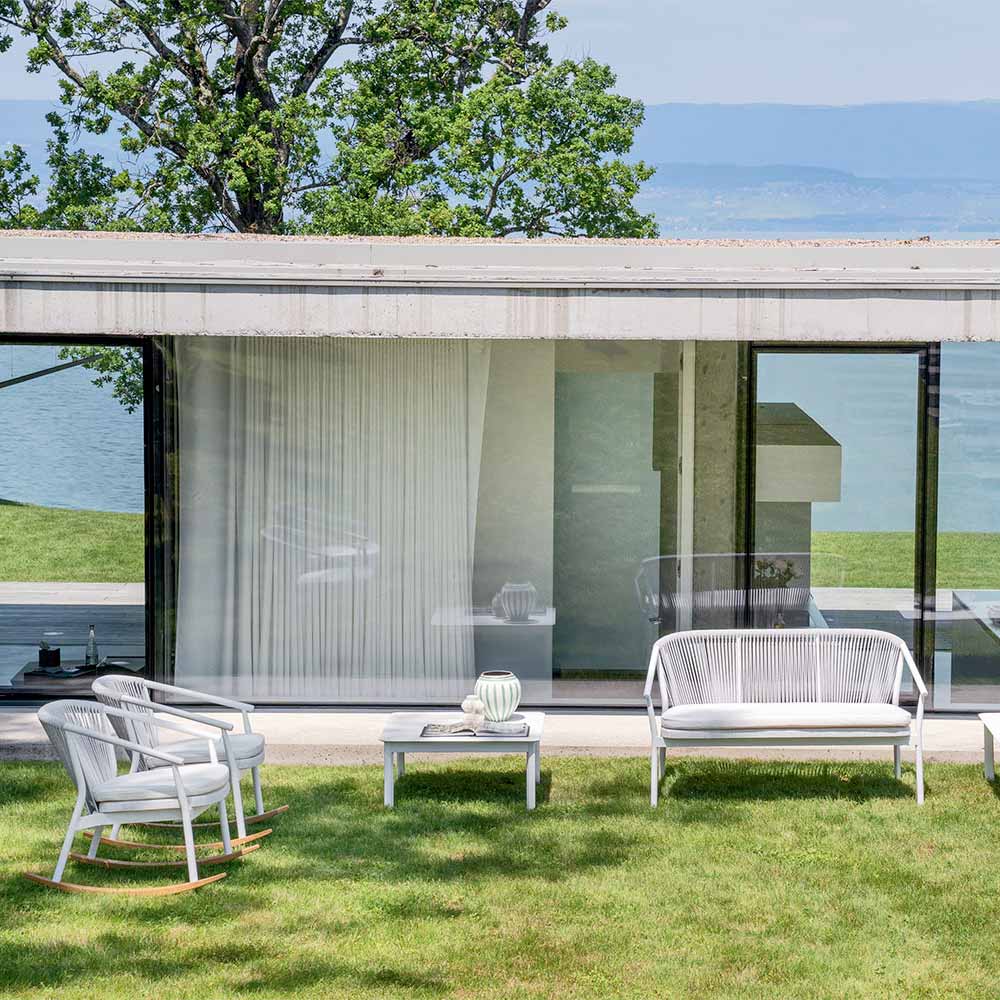 Die Verflechtung der Rückenlehne mit synthetischer Kordel VAR # TEX verbessert die Ästhetik dieses Sofas, das für Tage im Freien in Gesellschaft konzipiert wurde.