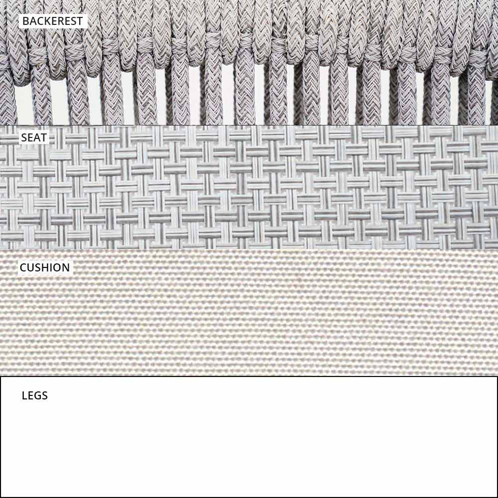 Smart wurde mit einer weißen pulverbeschichteten Aluminiumstruktur hergestellt , Sitz aus weißem VAR # TEX-Stoff und Rücken aus weißer VAR # TEX-Kunststoffschnur .