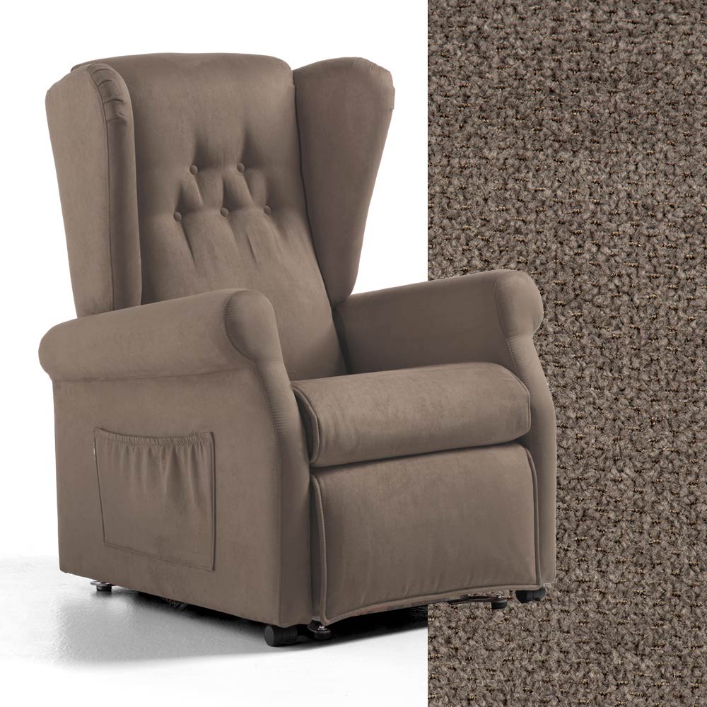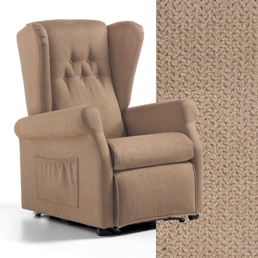 Sessel mit Eisen- und Holzstruktur , Polsterung aus unverformbarem Polyurethanschaum unterschiedlicher Dichte , 2-motorige Mechanik mit Hebe-/Entspannungs-/Bettfunktion und hochwertiger Stoff mit hoher Verschleißfestigkeit und Rollen als Standard.
