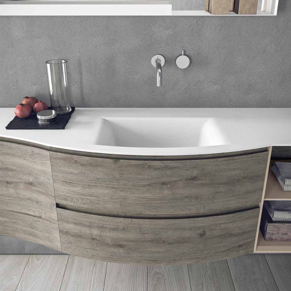 Badezimmer mit geschwungenen Fronten aus einfarbigem HPL- Eichenholz, integriertem Waschbecken aus mattweißem Teknorit , Schrankwand und offenem Boden aus glänzendem Corda-Lack.