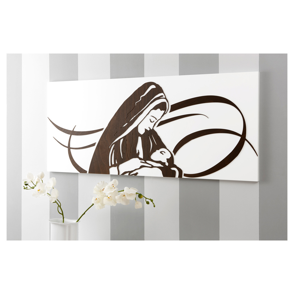 Kopfteil aus weiß lackiertem Holz mit Applikation der Madonna mit Kind aus Wengeholz.