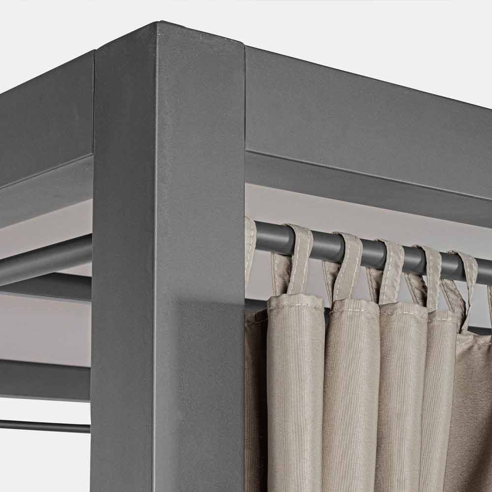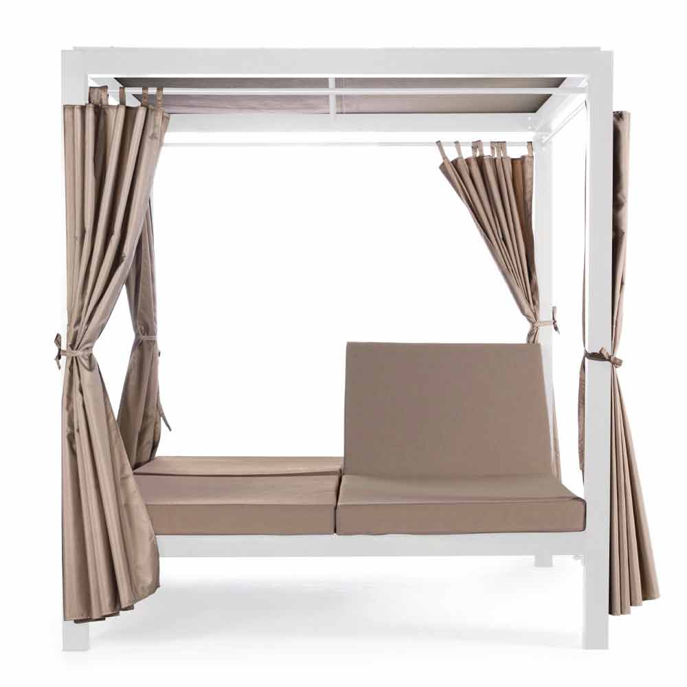 Pulverbeschichtete Aluminiumstruktur , 80x80mm Stangen, Dachstuch und Sitzkissen (abnehmbar) aus 1x1 Textilene , schnell trocknende Schaumstoffpolsterung für den Außenbereich. 4-Positionen-Rückenlehnen und Seitenvorhänge aus Polyester. Zusammenzubauen.
