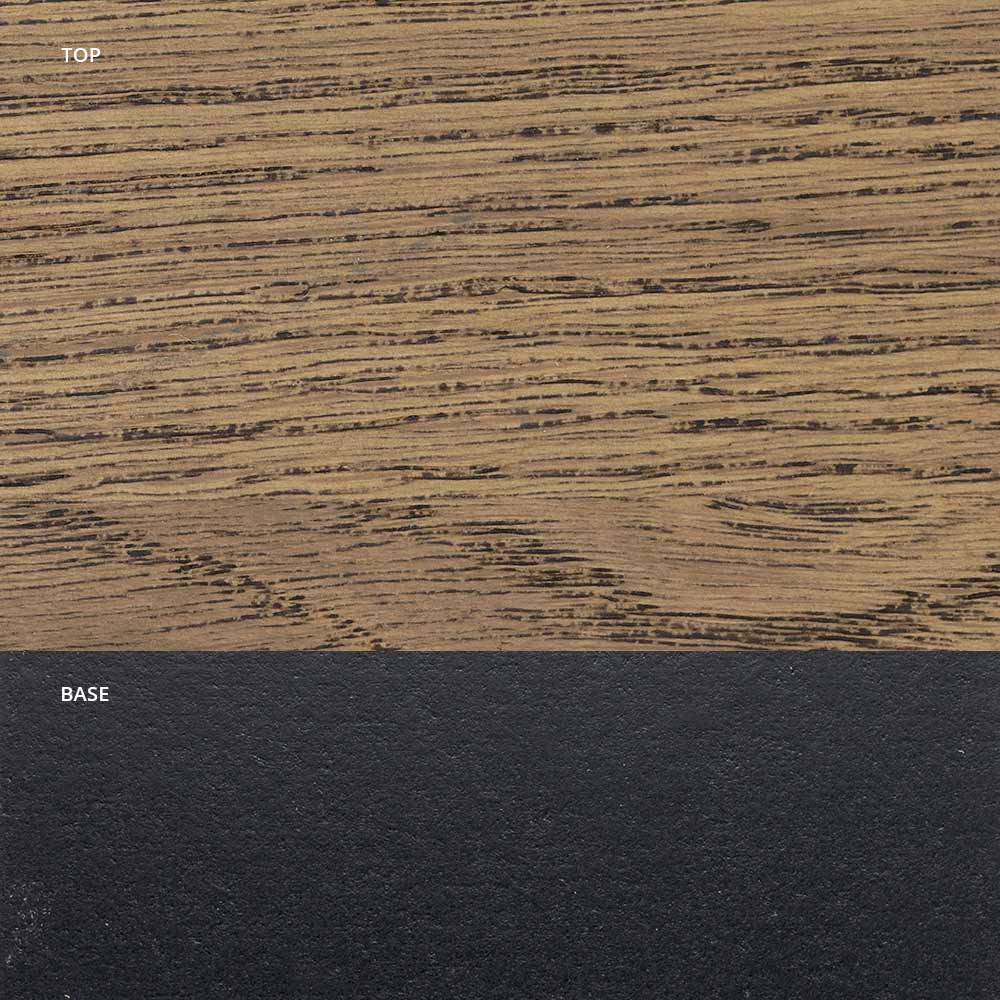 Die Platte dieses Tisches ist aus geknotetem Eichenfurnier in Scotch-Farbe und die Basis aus mattschwarzem Metall.