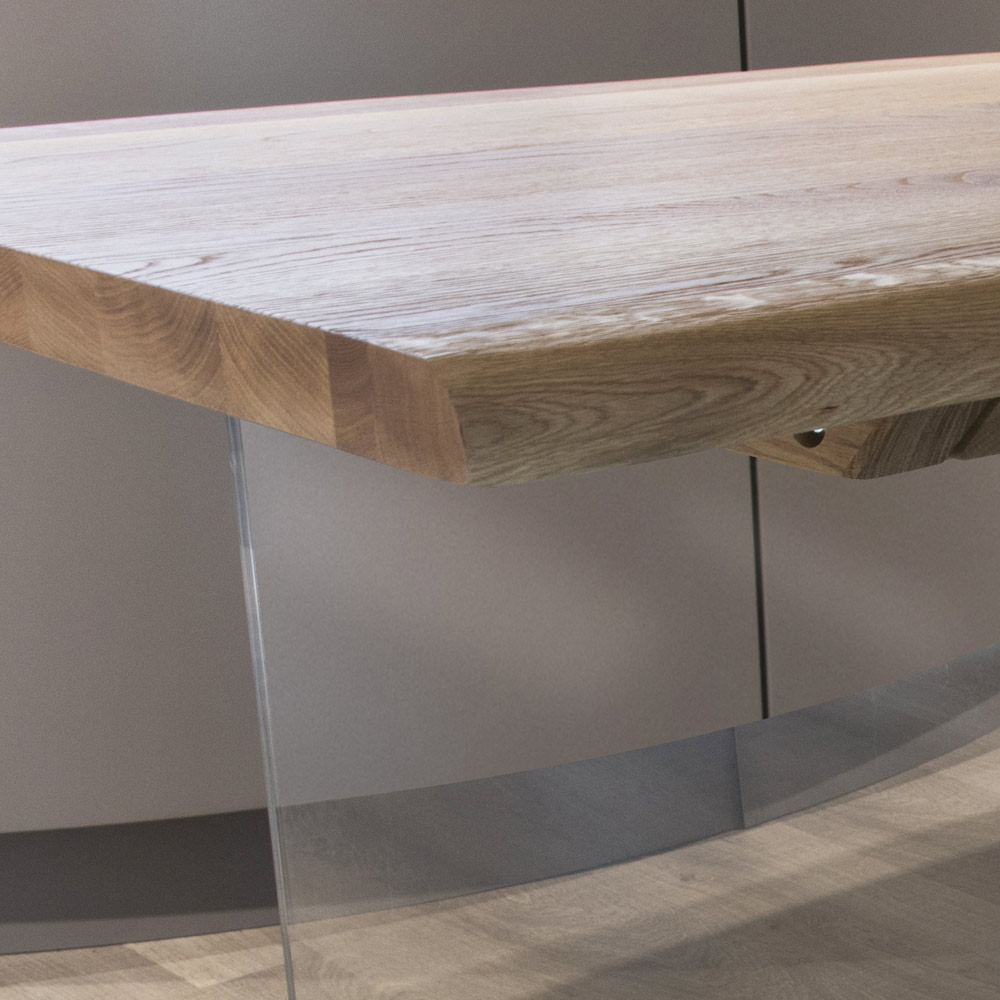 Die Platte dieses Tisches ist mit naturfarbener, massiver Asteiche furniert, während die Basis aus extraweißem Kristallglas besteht.