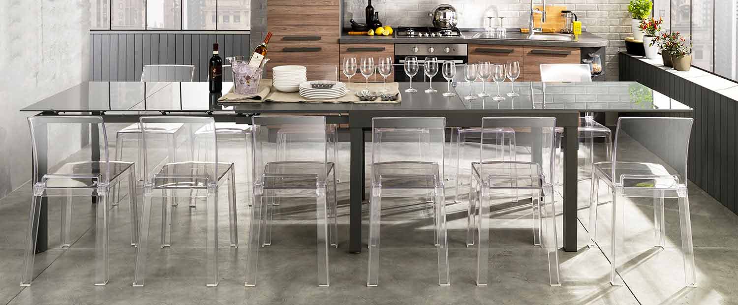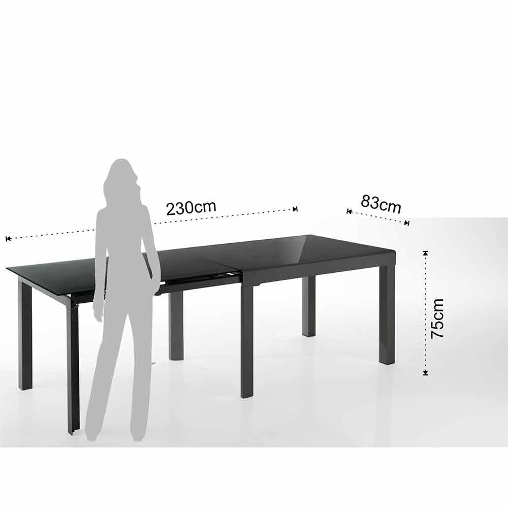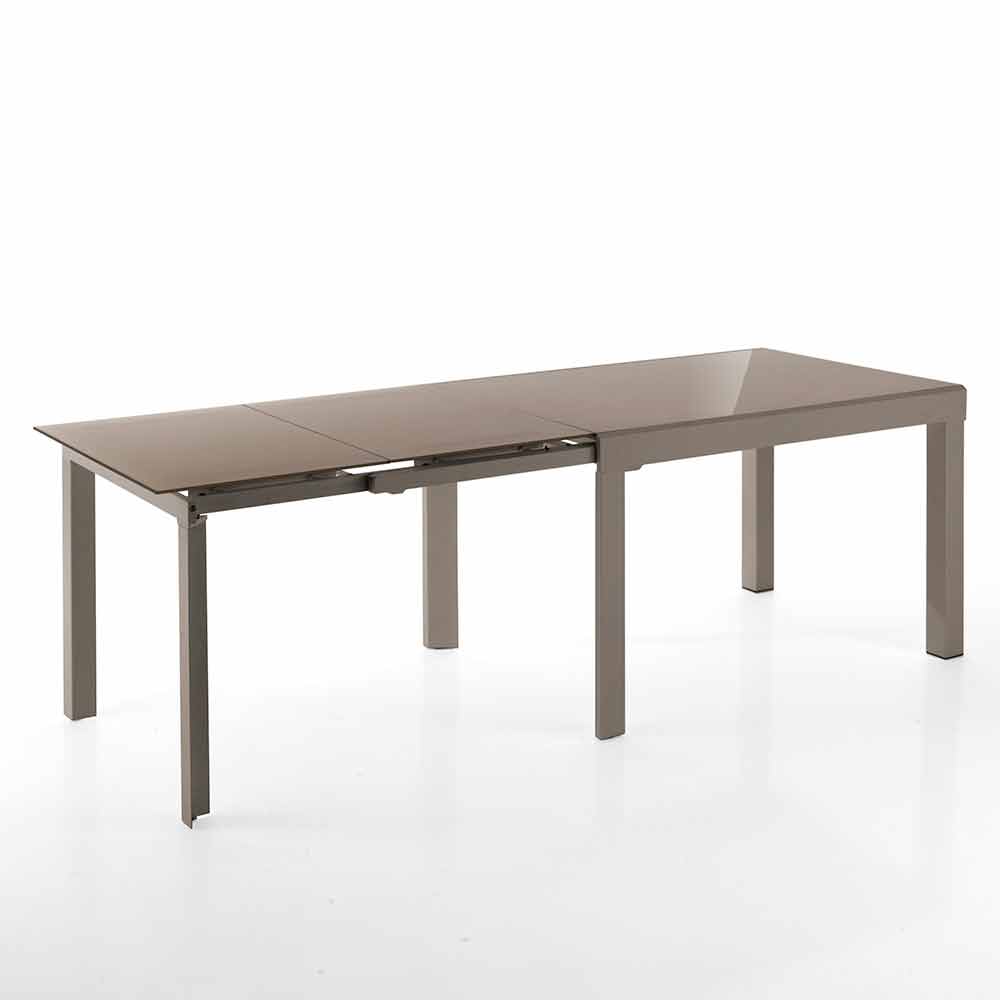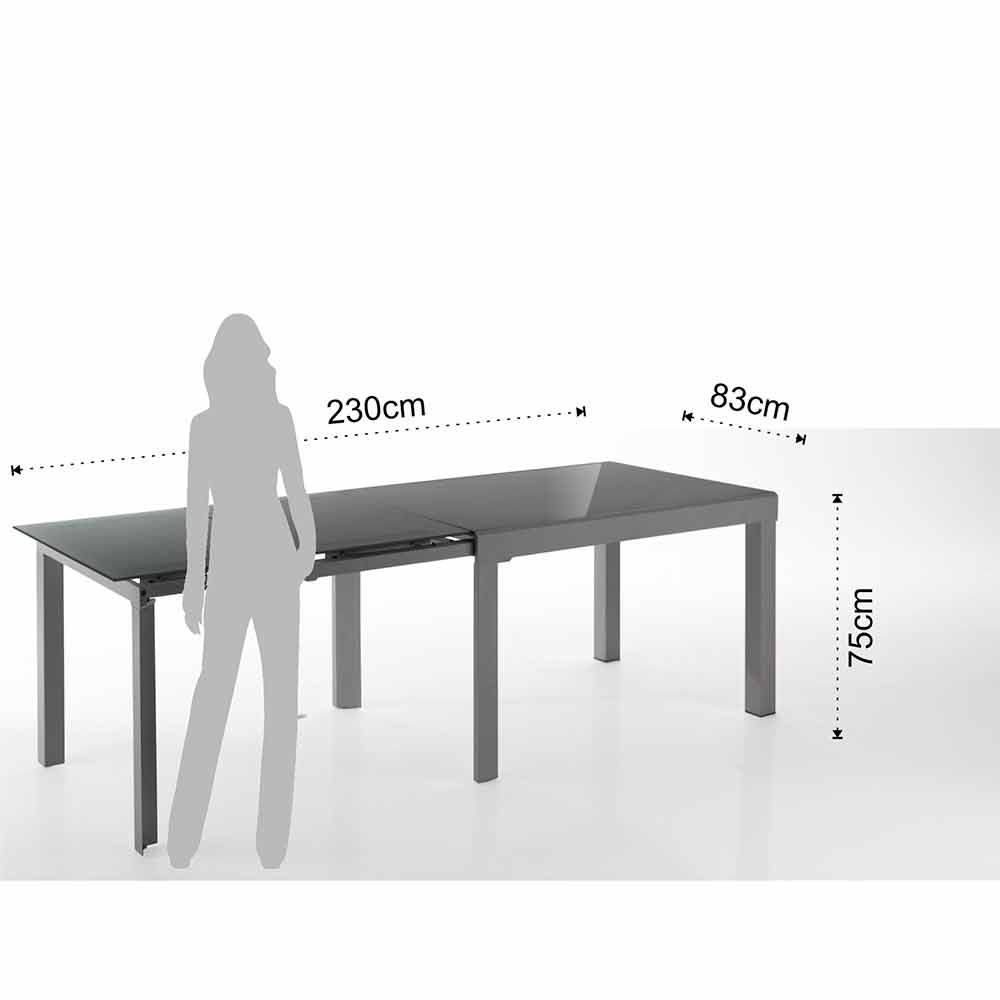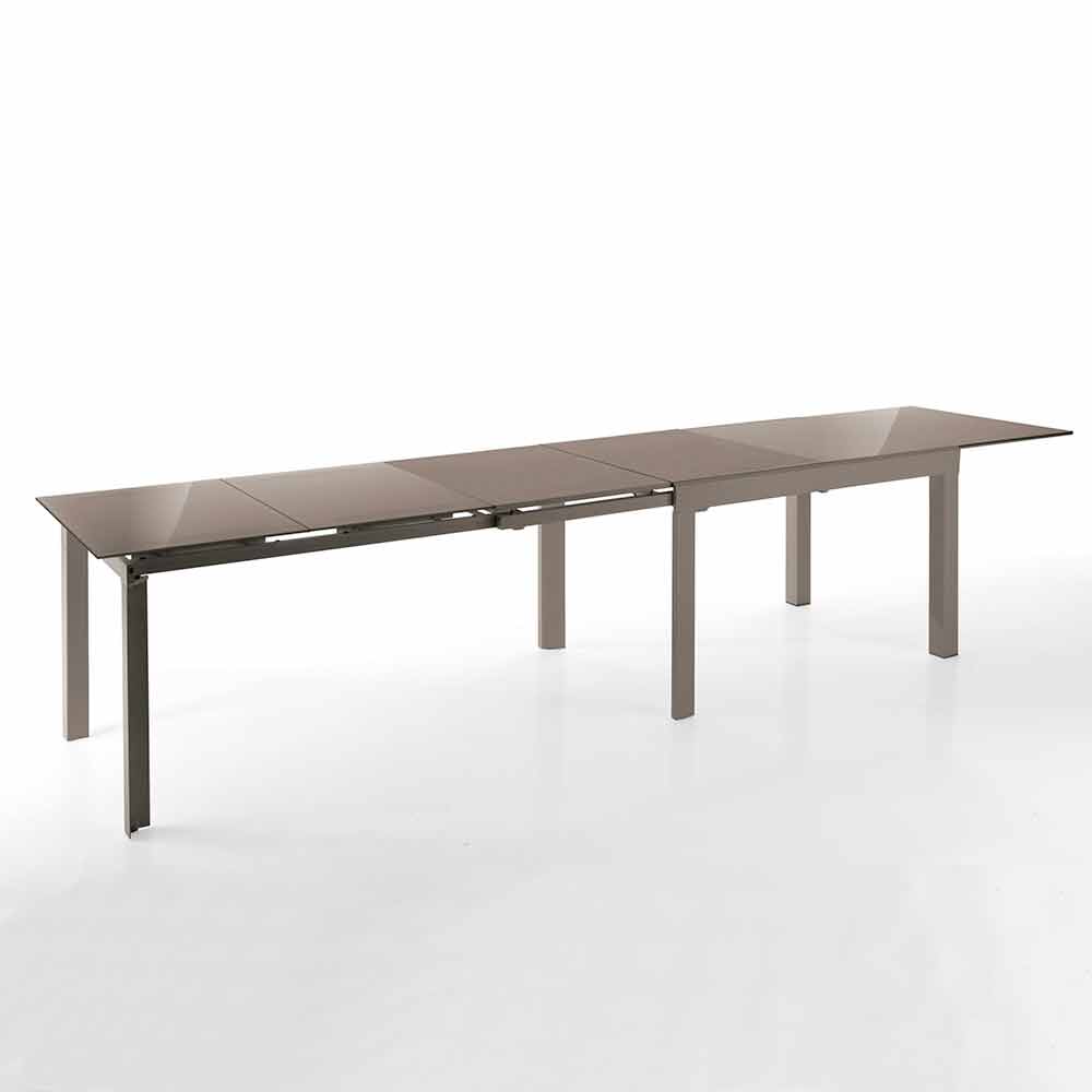 Guerriero ist ein praktischer und üppiger ausziehbarer Esstisch aus Temperglas (8 mm dick) mit Gestell aus lackiertem Metall, erhältlich in drei verschiedenen Ausführungen: