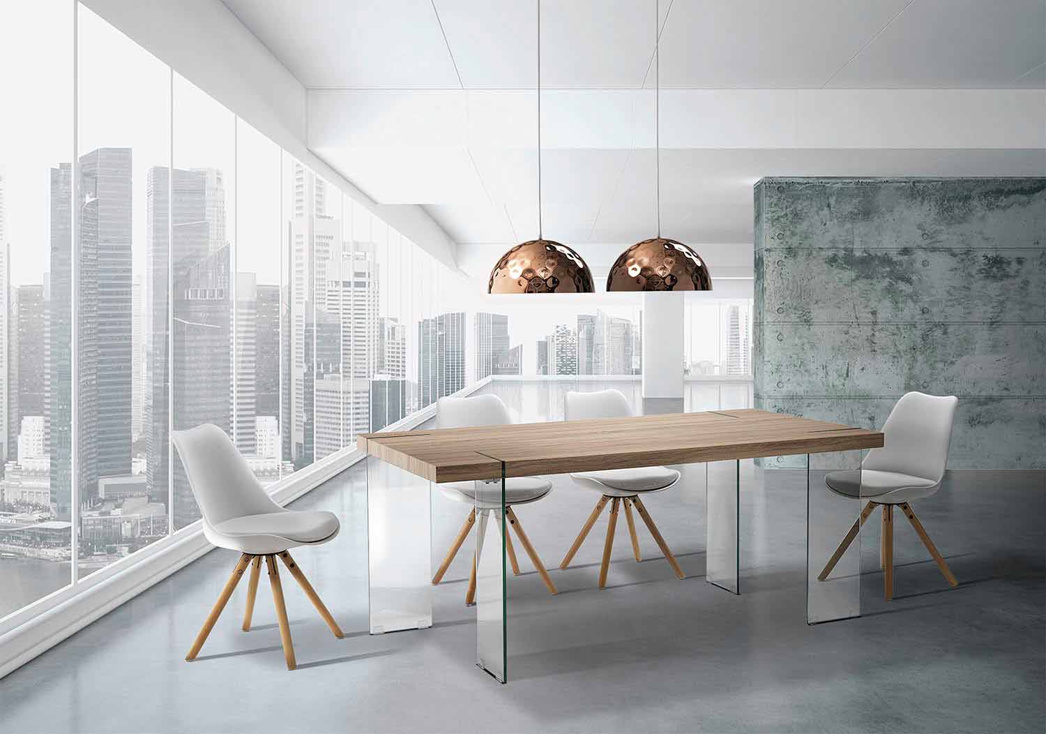 Joey ist ein Tisch mit einer 5,5 cm dicken MDF-Tischplatte, die mit 3D-Eichenpapier überzogen ist. 12mm dicke Basis aus gehärtetem Glas. Solido und voller Stil, perfekt für die Ausstattung alöl Ihrer Räume.