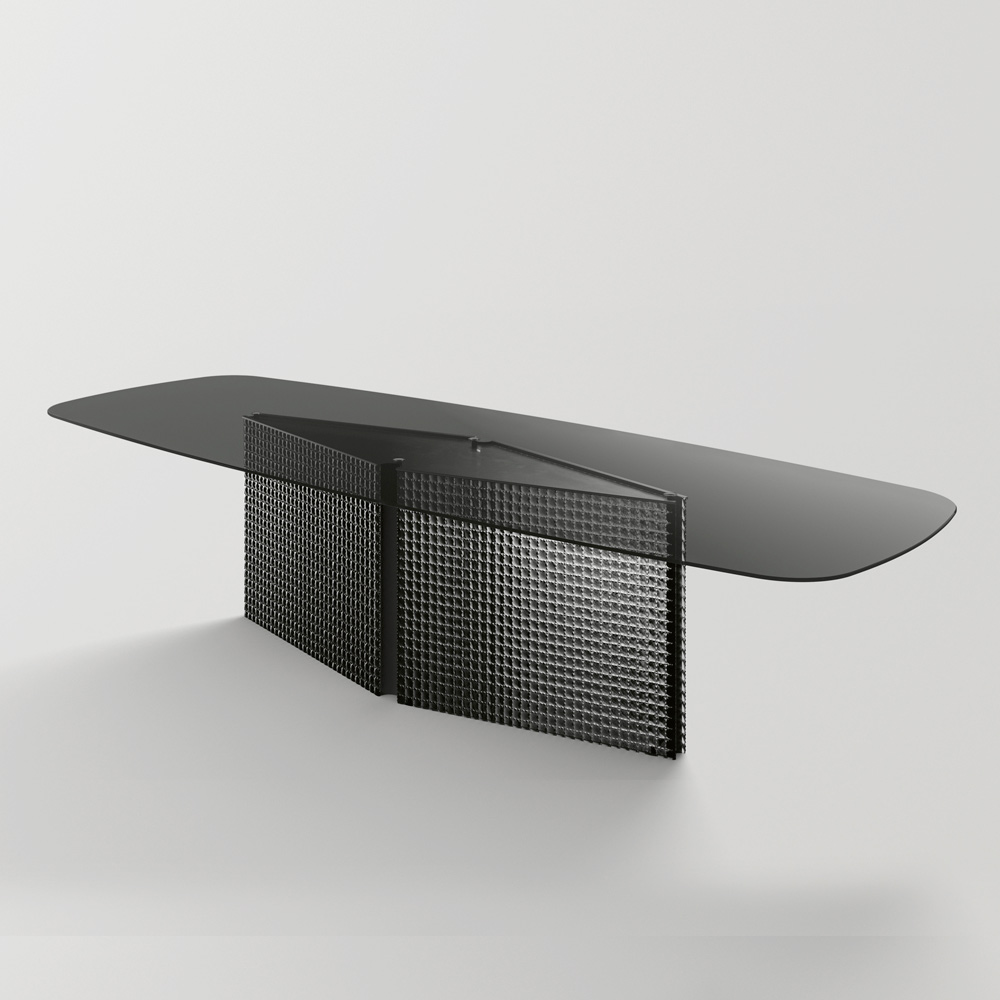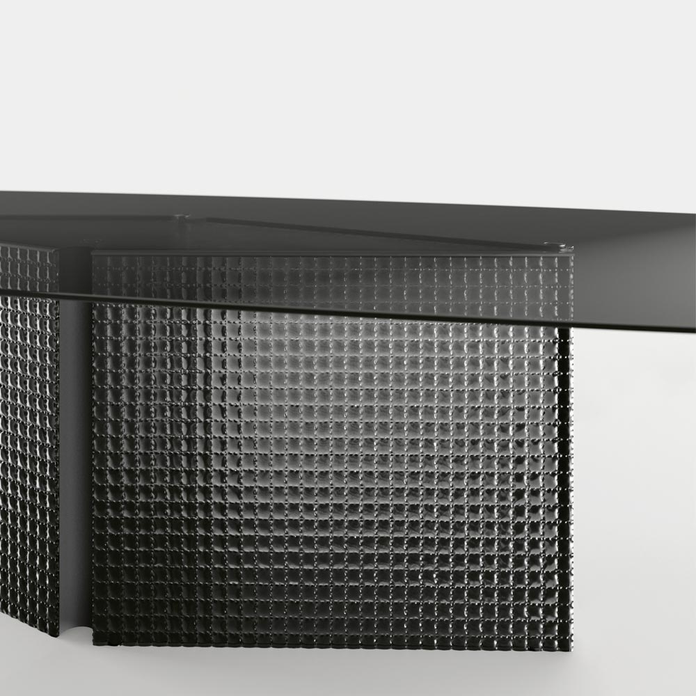 Wohnzimmertisch mit geformter Platte aus gehärtetem Glas, die durch Stahlplatten am Untergestell befestigt ist, und zentralem Untergestell aus geschmolzenen Glaselementen . Die Metallstrukturelemente des Untergestells sind mattschwarz lackiert. Die höhenverstellbaren Füße , die unter dem Untergestell verborgen sind, ermöglichen eine perfekte Nivellierung des Tisches.
