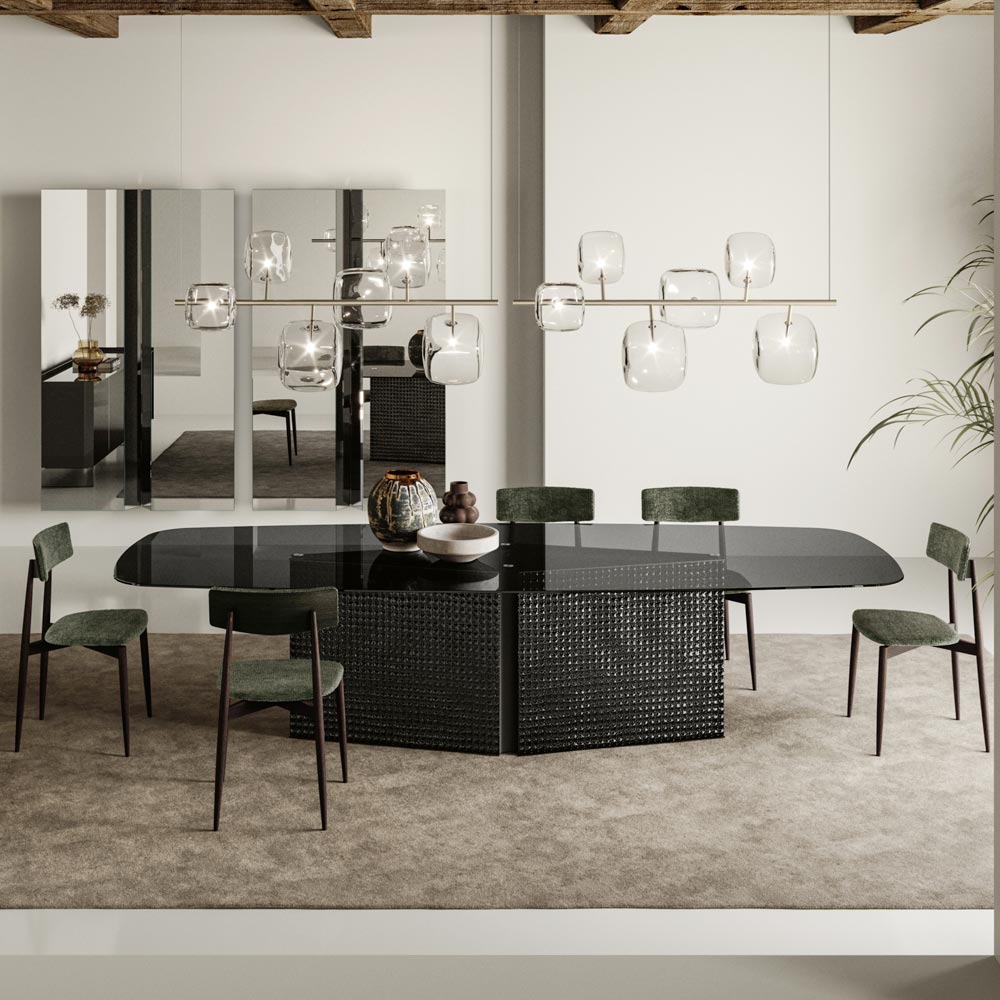 Dieser Esstisch ist ein Beispiel für Avantgarde-Design, das Eleganz und Funktionalität vereint. Seine schlanke, längliche Silhouette mit einer Glasplatte bietet eine glatte, raffinierte Oberfläche, ideal für ein formelles Abendessen oder als Mittelpunkt in einem modern gestalteten Raum.