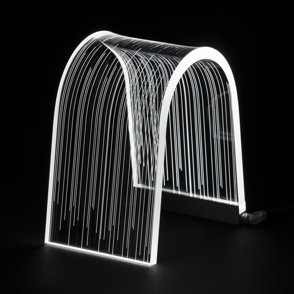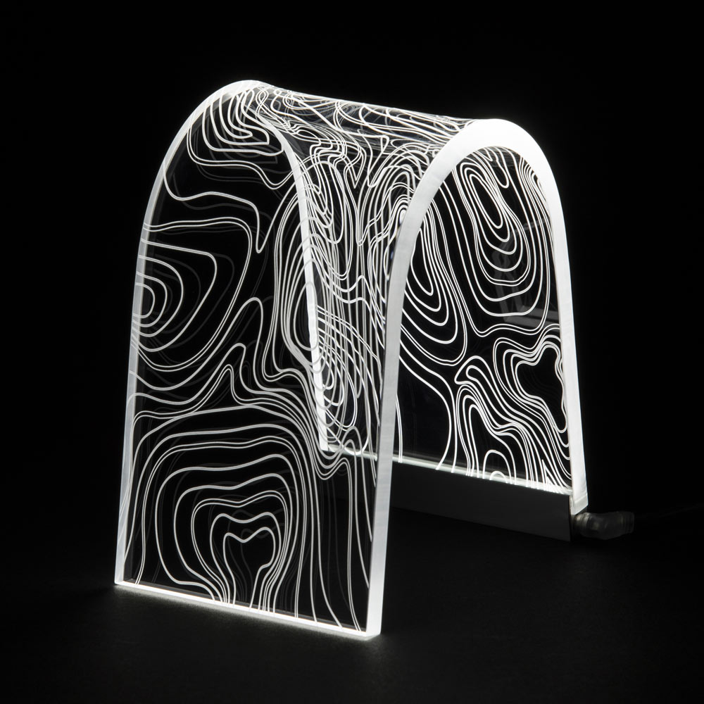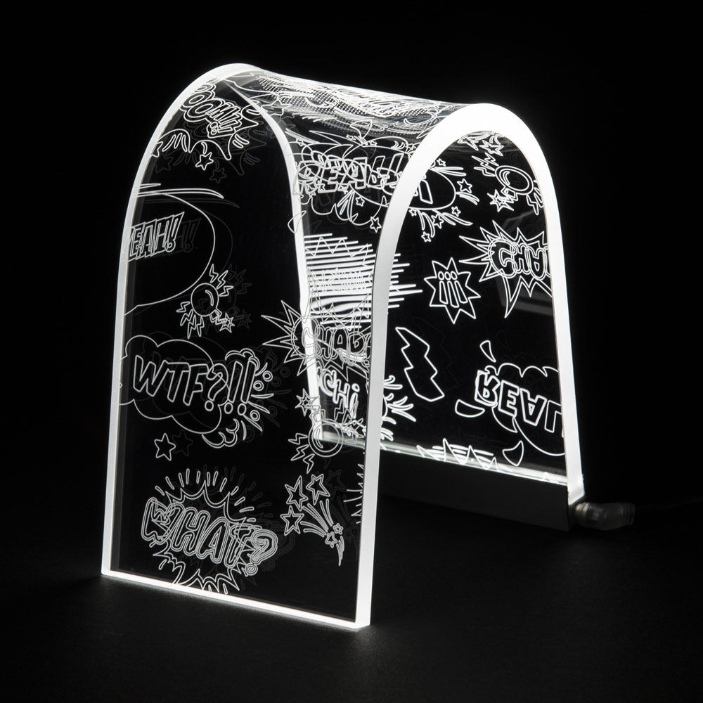 Bogen-Stützlampe aus Acrylglas und lasergravierten Dekorationen, 2 Größen, hergestellt in Italien.