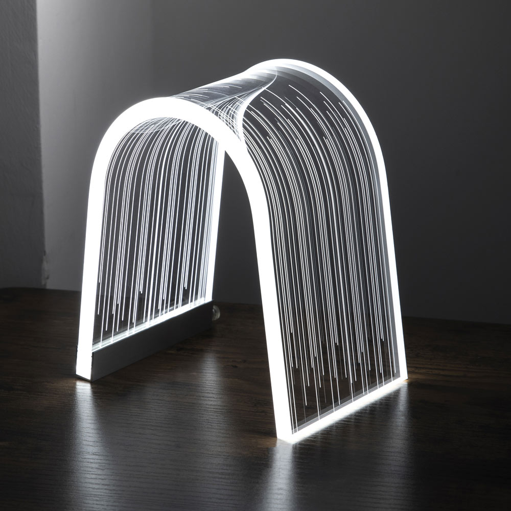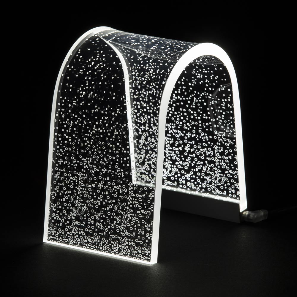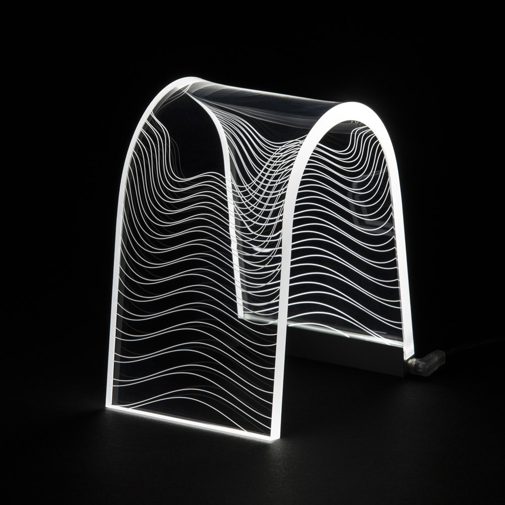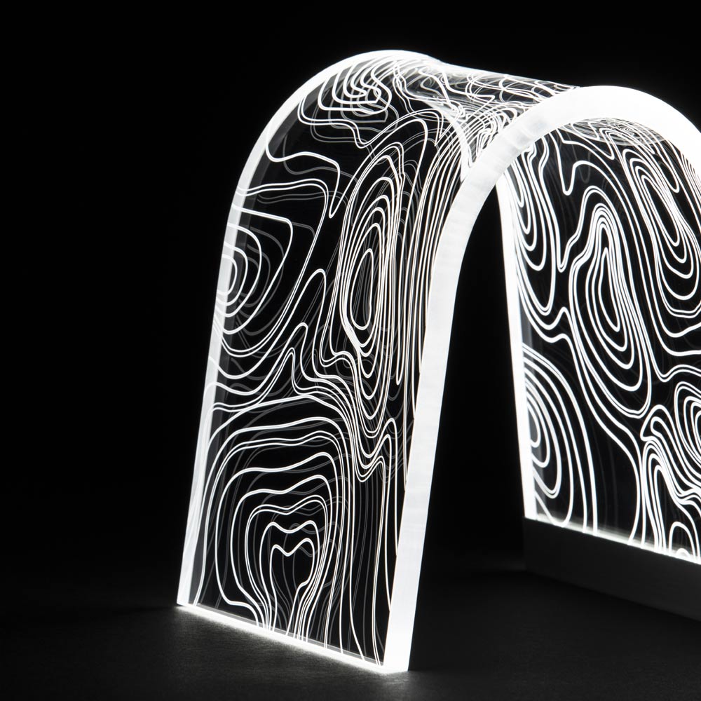 Bogen-Stützlampe aus Acrylglas und lasergravierten Dekorationen, 2 Größen, hergestellt in Italien.