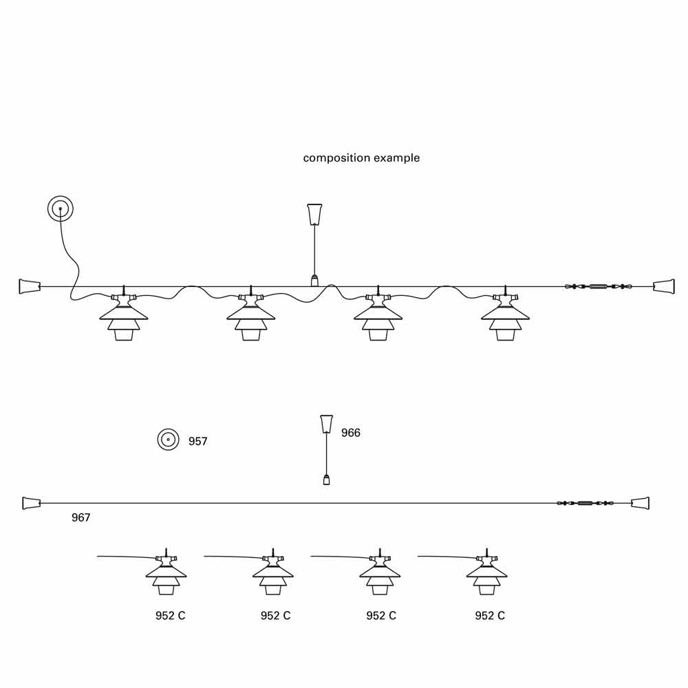 Dank des Battersea-Deckenbaldachins ist es möglich, verschiedene Arten von Lampen aus der Battersea-Serie (Art. 951, 954-22, 952) zu kombinieren, um interessante Lichtspiele zu schaffen.
