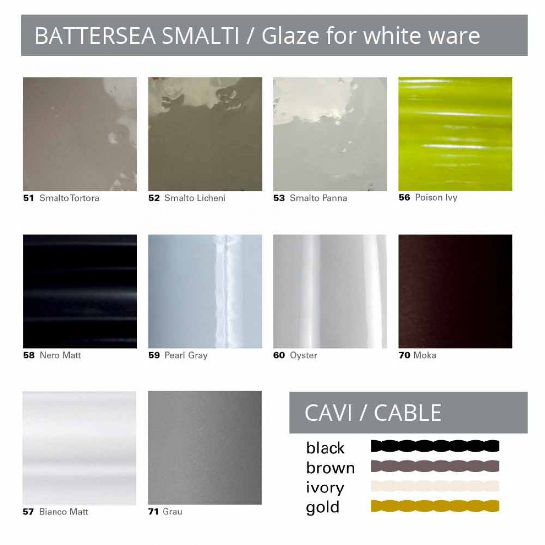 Hinweis: Lampe in verschiedenen chromatischen Variationen erhältlich, sowohl für die äußere Oberfläche als auch für das Stromkabel. Sehen Sie sich die Farbkarte an und geben Sie die gewünschten Farbcodes in das entsprechende Feld ein.