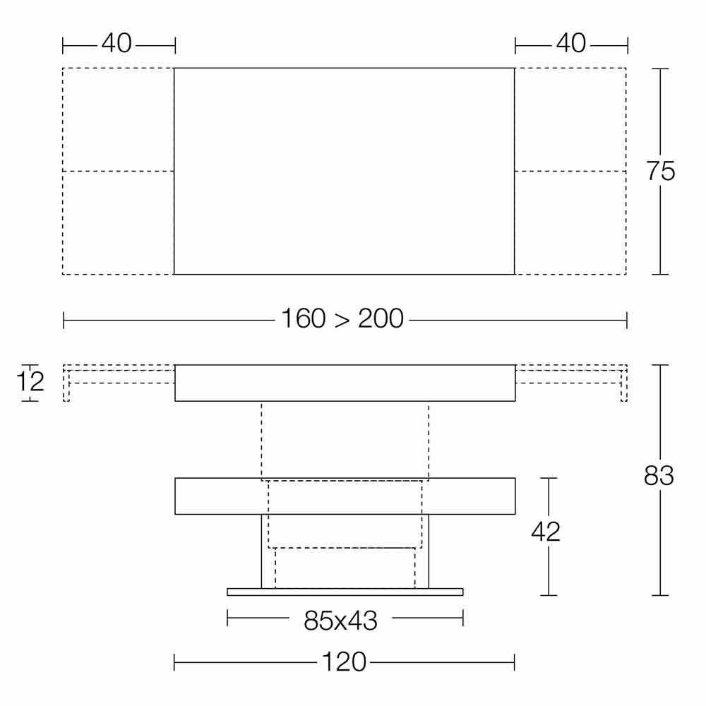Die Platte ist mit zwei seitlichen Verlängerungsplatten von jeweils 40 cm (innen) erweiterbar.