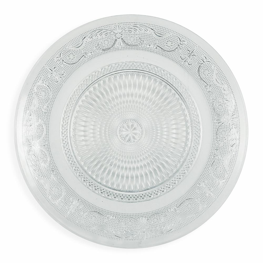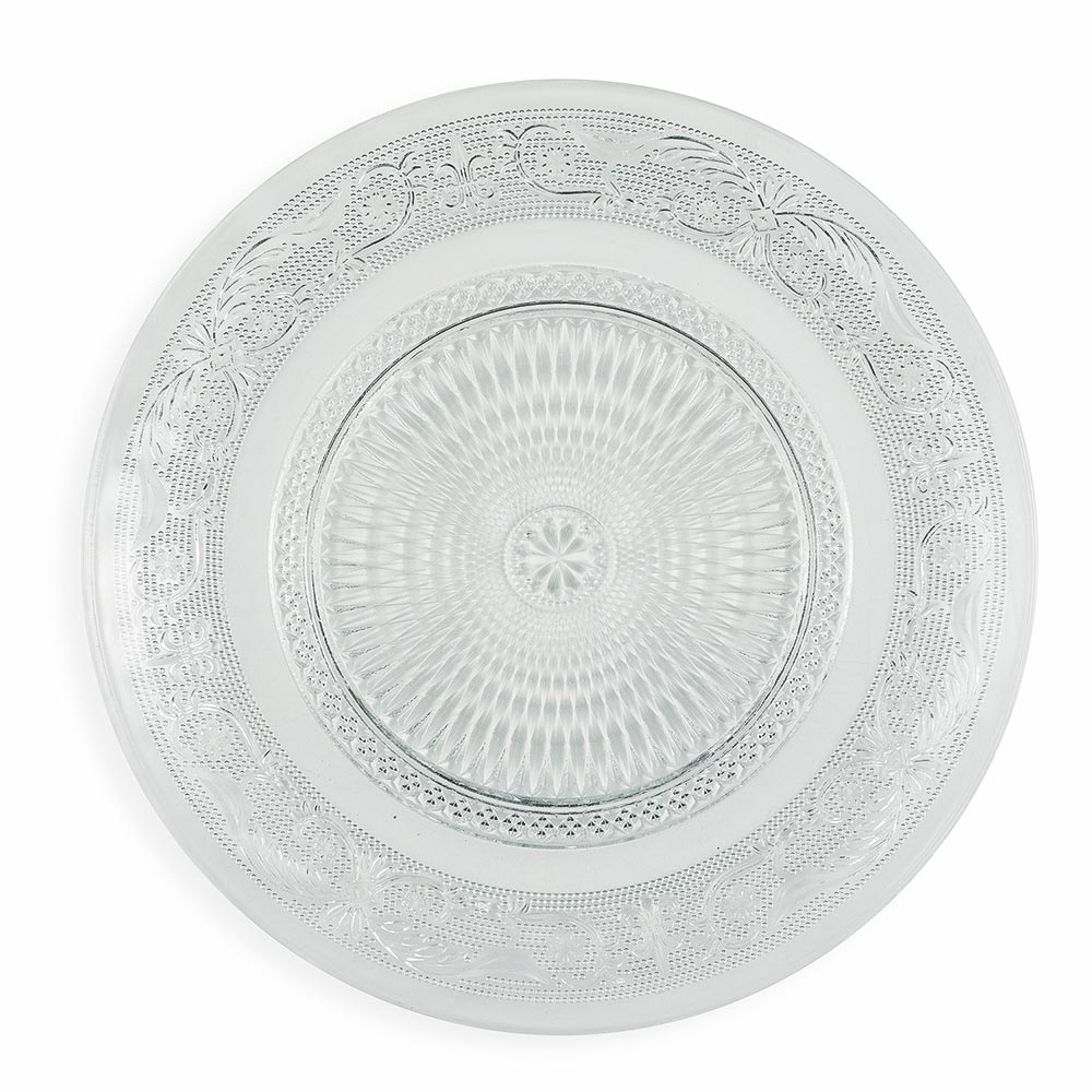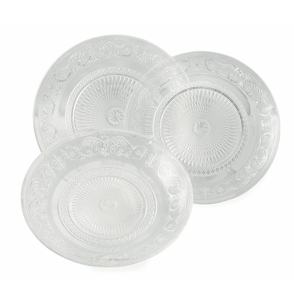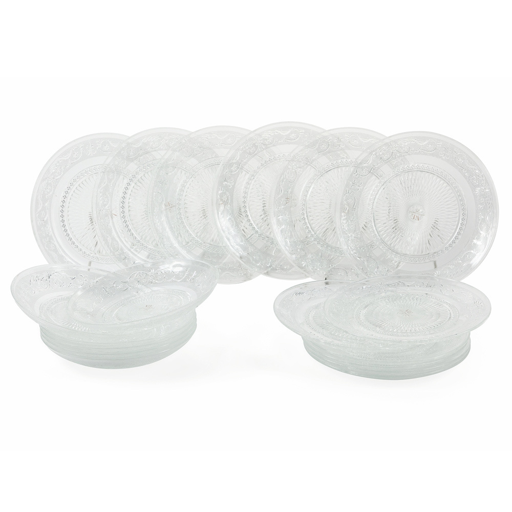 Set aus 18-teilig dekorierten transparenten Glastellern.