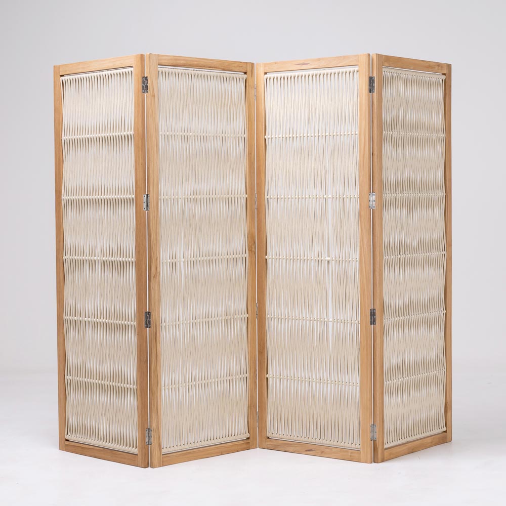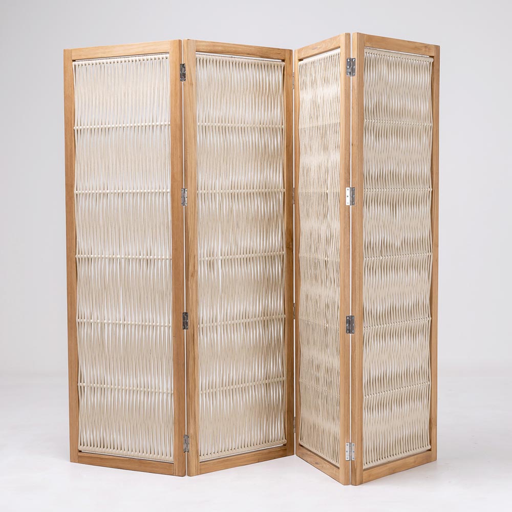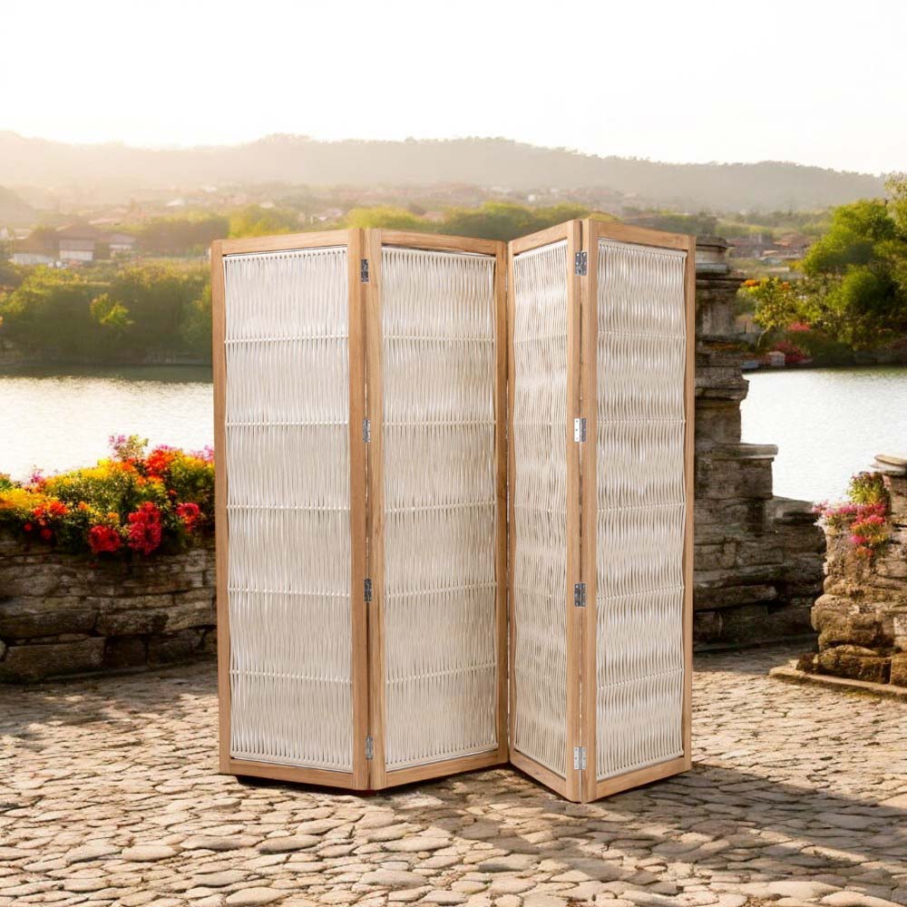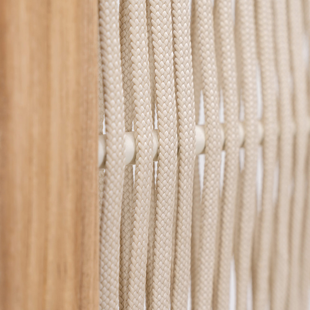 Trennwand für den Außenbereich mit Struktur aus Teakholz und Aluminium, Polypropylen-Seilgeflecht (perlweißes Finish) und Olefin (Desert Mix Finish).