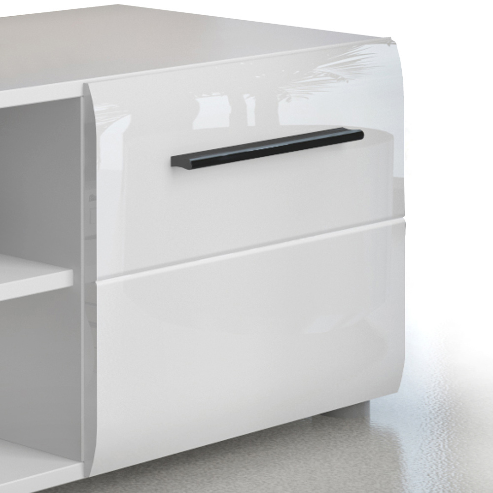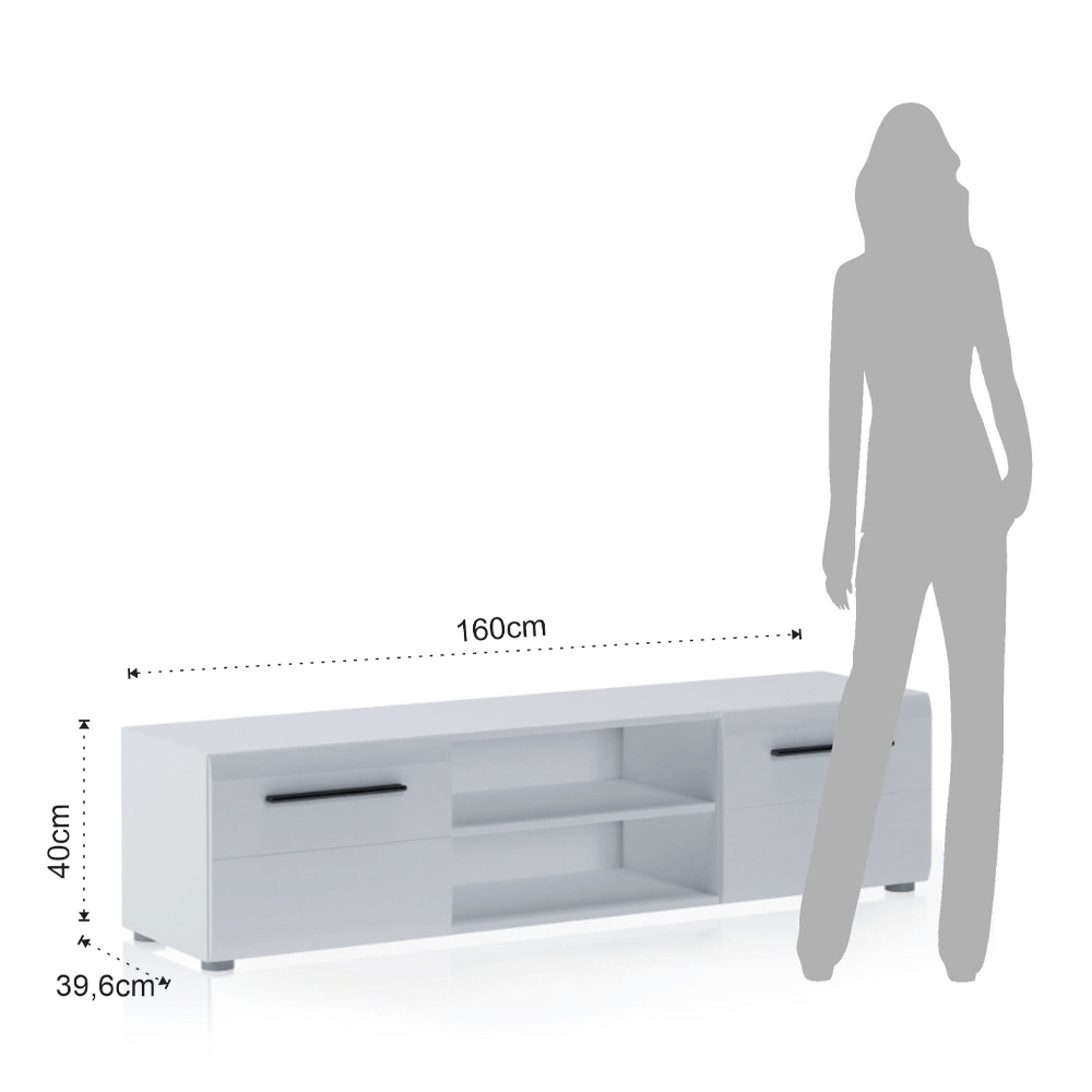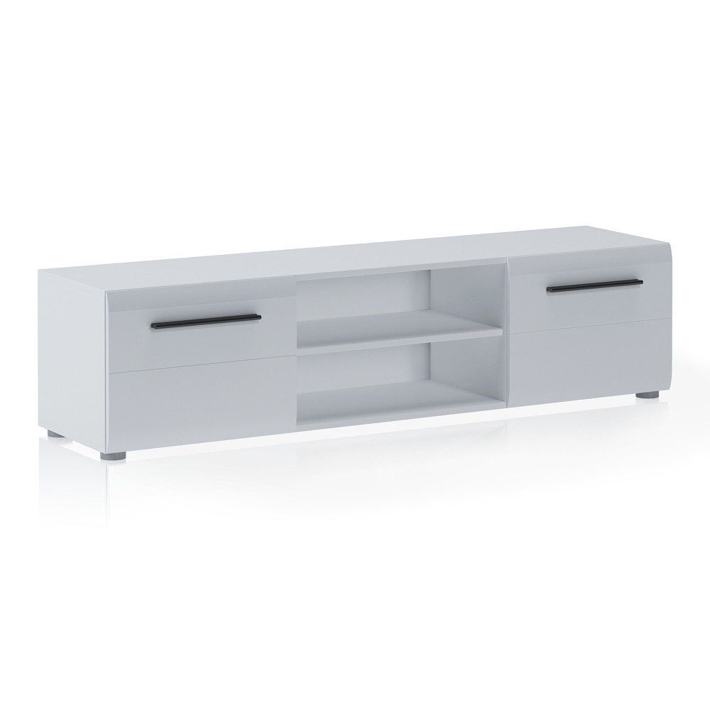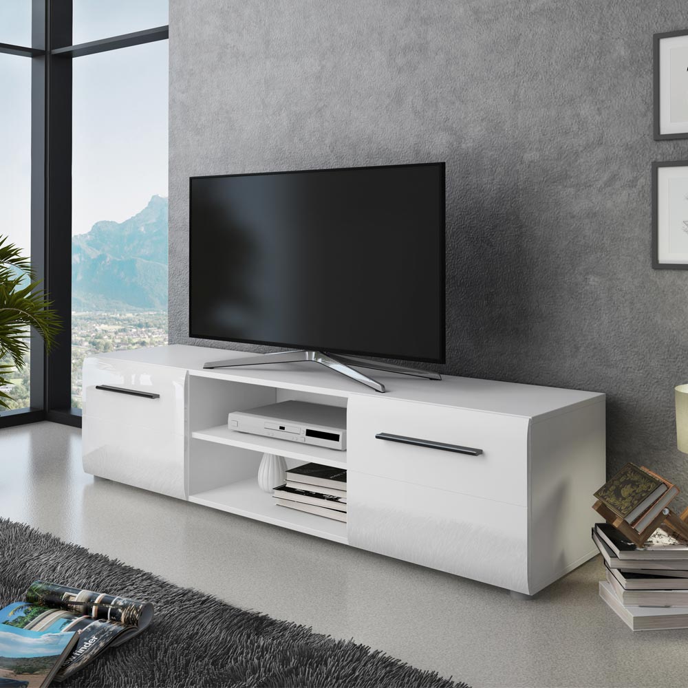 TV-Ständer aus ökologischen Holzspanplatten , Struktur mit mattweißem Melamin überzogen, mit 2 glänzend weiß lackierten Türen und einem offenen Fach mit Regal. Dank seiner Verarbeitung eignet sich dieses Möbelstück perfekt zur Vervollständigung der Einrichtung jedes Wohn- und Aufenthaltsraums. Dank der Türen und des offenen Fachs bietet er viel Fassungsvermögen und Platz zum Aufbewahren von Gegenständen, sodass diese stets ordentlich und griffbereit sind.