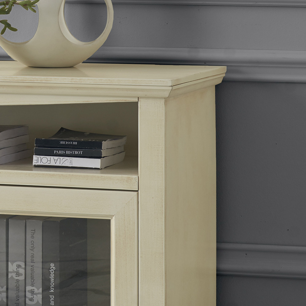 Dieses Möbelstück bietet dank seiner Formen und Zusammensetzung Kapazität, Funktionalität und Design. Dank des Glases können Sie Gegenstände aufbewahren und zur Schau stellen, Sie können Dinge platzieren, um den Raum aufzuräumen, und nützliche Geräte auf dem Fernseher platzieren. Dank der Ausführungen und Farben können Sie die Einrichtung jedes Wohnbereichs individuell gestalten und vervollständigen.