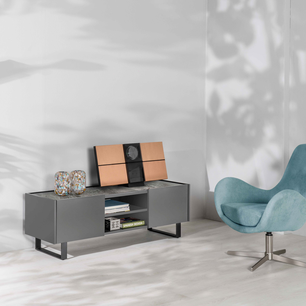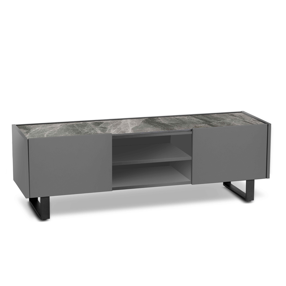 TV-Schrank für den Innenbereich mit Keramikplatte in grauem Marmoreffekt , MDF-Struktur mit dunkelgrauem Eichenfurnier , Metallbeinen,2 Türen mit Soft-Closing und 2 offenen Fächern . Klassisch und anmutig zeichnen sich diese furnierten MDF-Möbel durch ihren modernen Charakter und ihre klaren Linien aus. Die Keramikplatte mit Marmoreffekt ruht auf der raffinierten und diskreten Struktur. Durch den sanften Schließmechanismus ist dieser Artikel mit modernen Häusern kompatibel, die Wert auf Funktionalität legen, ohne auf einen Hauch von Klasse zu verzichten.