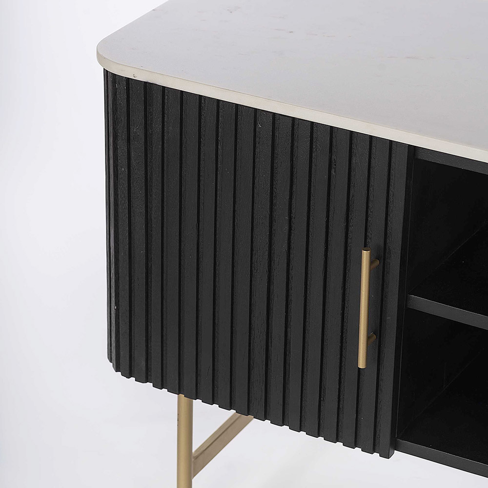 Dieser TV-Ständer ist die Essenz zeitgenössischer Eleganz, die modernes Design und Funktionalität vereint. Der schwarze, gerillte Holzrahmen sorgt für einen raffinierten dreidimensionalen Effekt, der durch die glatte Tischplatte perfekt ausgeglichen wird und einen raffinierten Touch verleiht. Die dünnen, aber stabilen goldenen Metallbeine verleihen optische Leichtigkeit und sorgen für Stabilität.