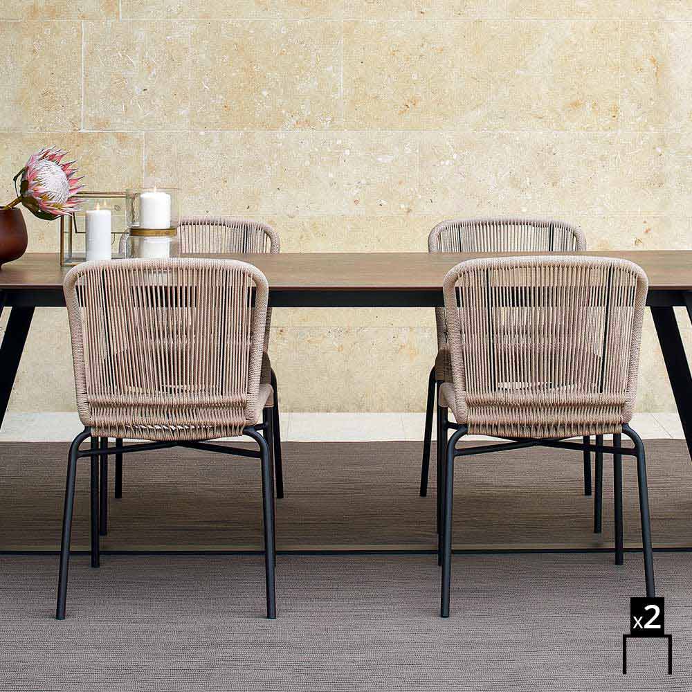 Das Set besteht aus zwei Outdoor Stühle, die handgeflochten Synthetikfasern bilden zusammen mit der pulverlackierten Aluminiumgerüst ein witterungsbeständiges und UV beständige Sitzmöglichkeit. Das Design eignet sich aufgrund des hochwertigen Materialies sowohl für den Außenbereich als auch optisch für den Innenbereich. Die alte Rattan Optik in neumoderner Form ebnete den Weg für ein Gitter aus witterungsbeständigen, farbigen Synthetikfasern.