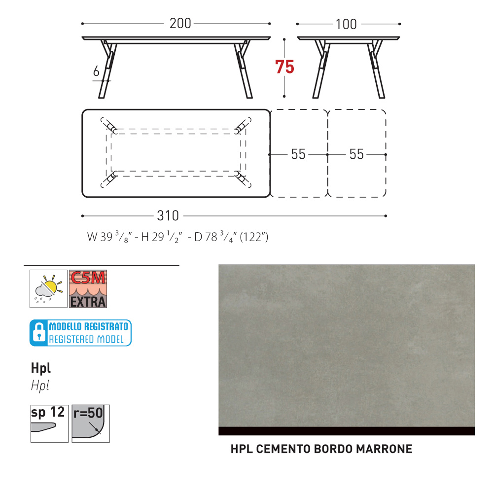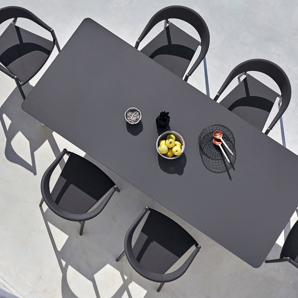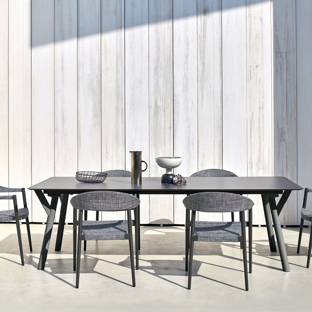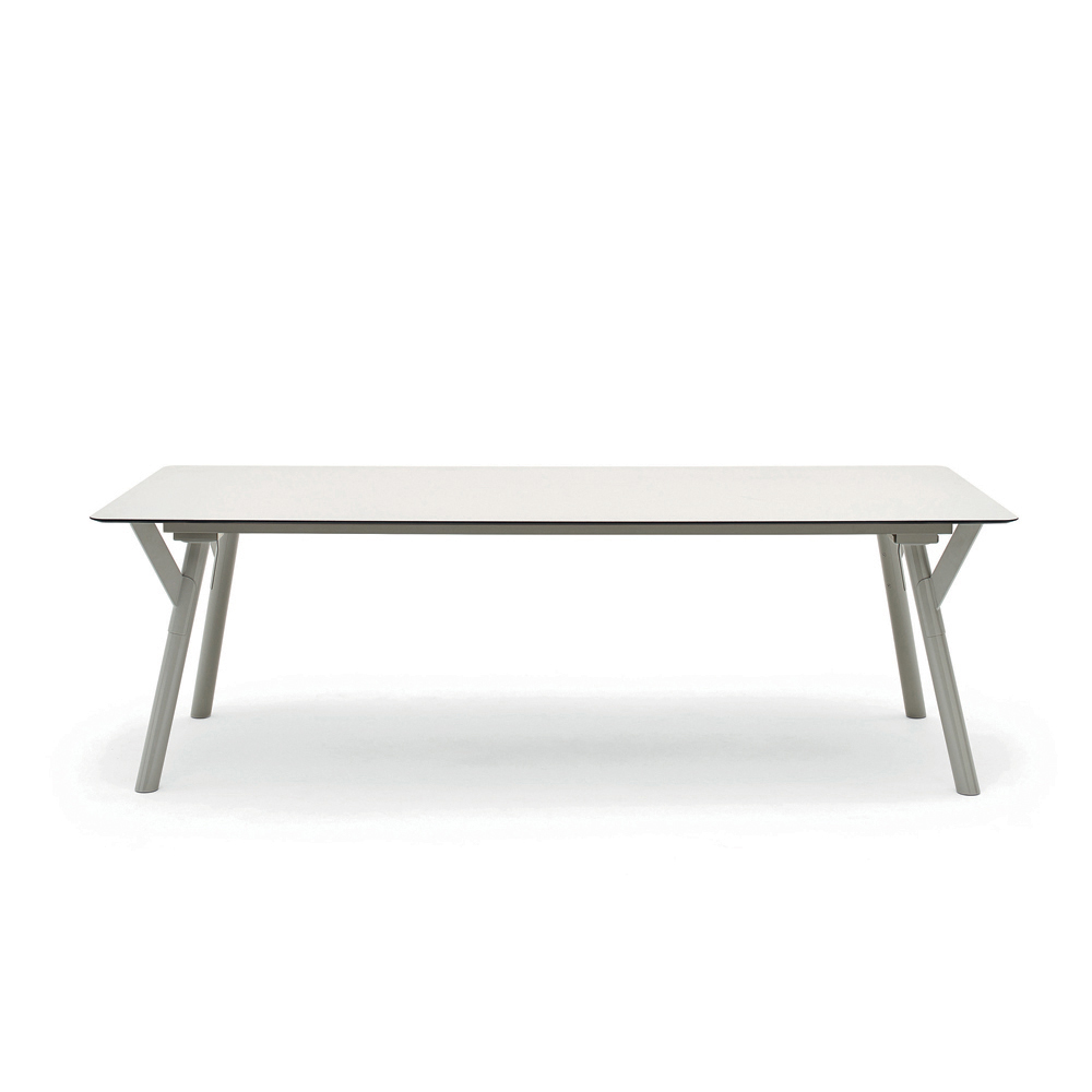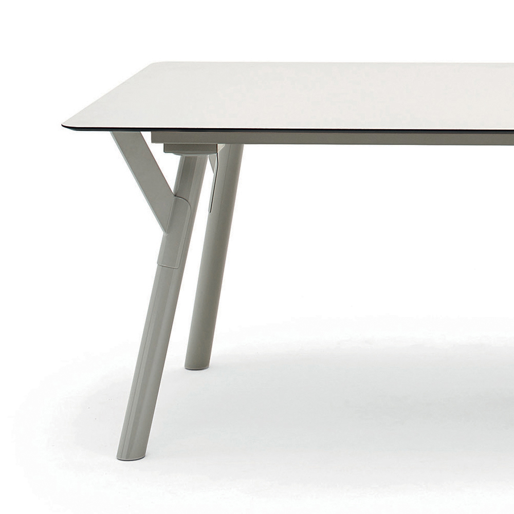 Link ist ein moderner Designtisch mit Struktur (Klammer + Beine) aus lackiertem Edelstahl. Die Platte ist in HPL (Stärke 12 mm) oder in Teakholz (Stärke 30 mm) erhältlich. Dank seines vielseitigen Designs kann er sowohl als ausziehbarer Outdoor-Tisch als auch zur Einrichtung von Innenräumen verwendet werden. Es sind verschiedene Ausführungen erhältlich, mit denen die Struktur, die Beine und die Tischplatte individuell gestaltet werden können.